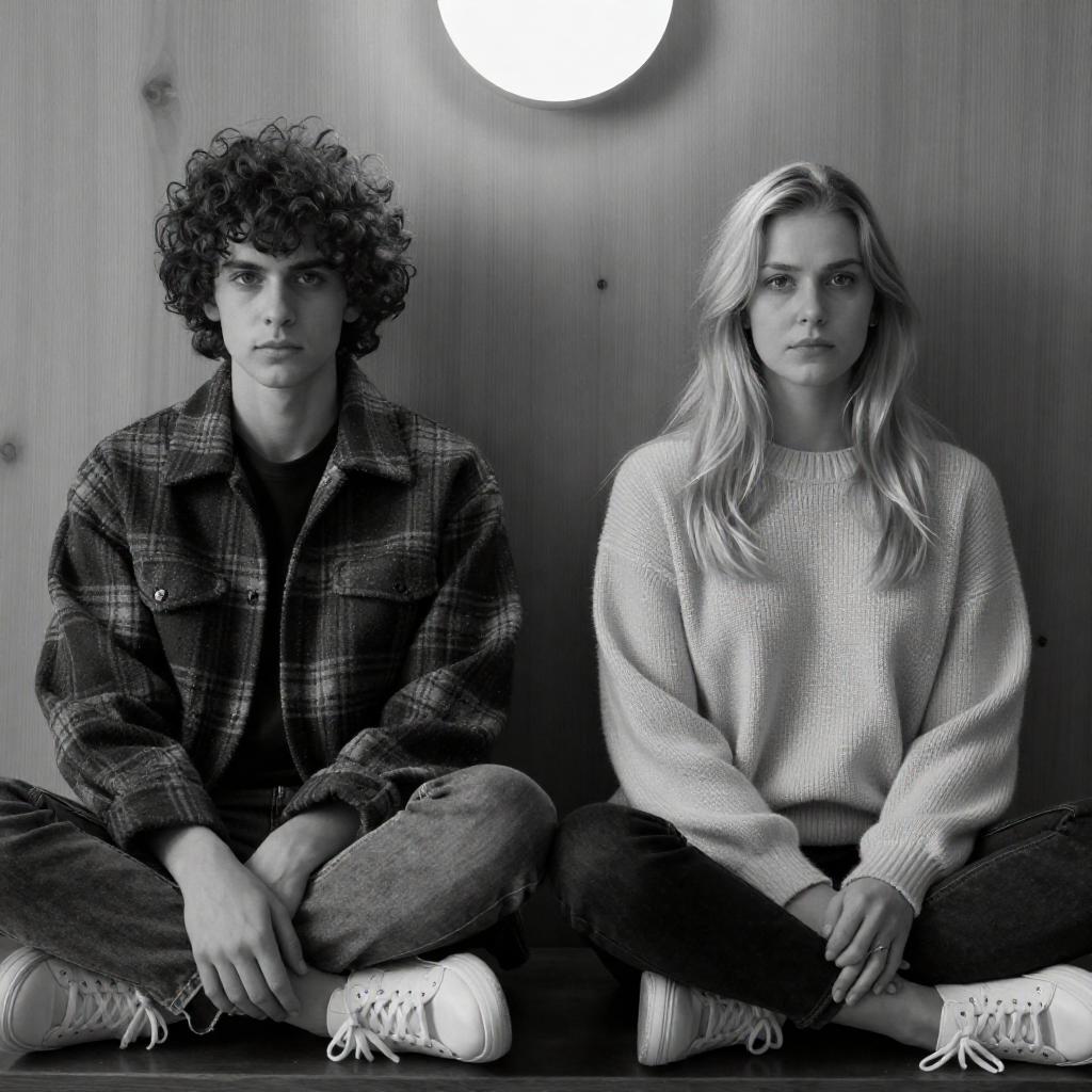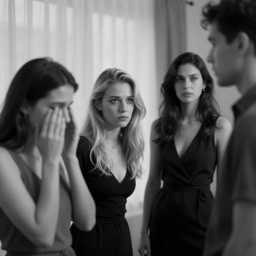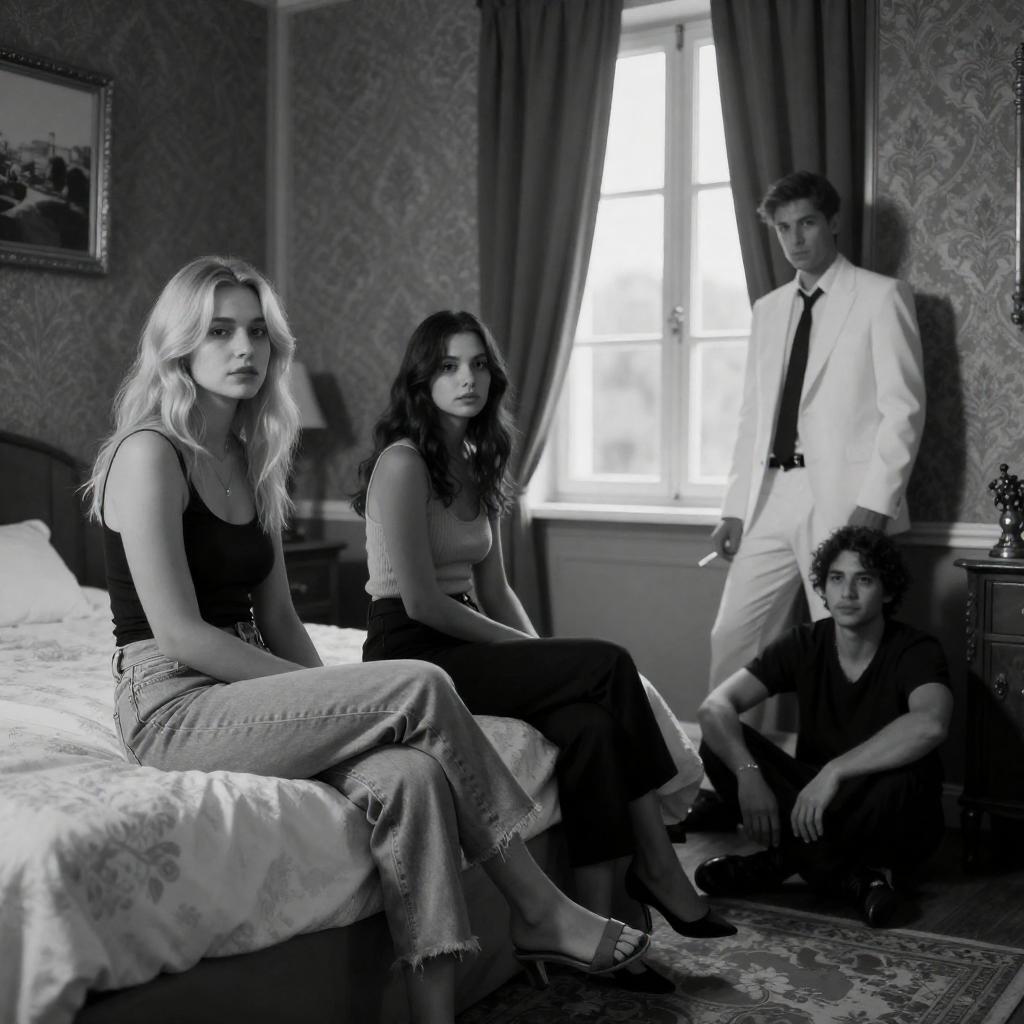 Black-and-white photograph of four people in a patterned room. Two women sit on a bed, one with blonde hair and the other with dark hair, both in casual clothes. A man in a white suit and tie stands near the window, holding a cigarette. Another man with dark hair, also in casual clothes, sits on the floor. The room has ornate wallpaper and a framed picture on the wall.