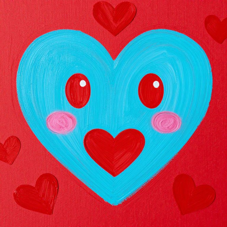 Vibrant heart-shaped faces painted in turquoise blue and red valentine hues, featuring bold red eyes, rosy cheeks, and a central red heart mouth, surrounded by scattered red hearts against a textured red background.