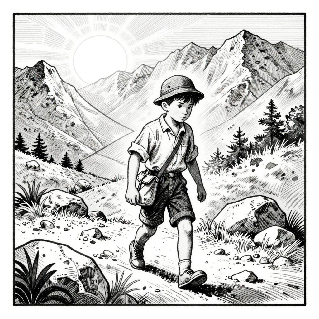 This is a black-and-white, vintage-style line drawing of a young boy walking through a rocky, mountainous landscape. He's wearing a hat and a loose shirt with shorts, carrying a small bag over his shoulder. The sun shines brightly in the background, casting shadows on the boy and the terrain. The drawing has a detailed, textured look with cross-hatching and fine lines, bordered by a frame.