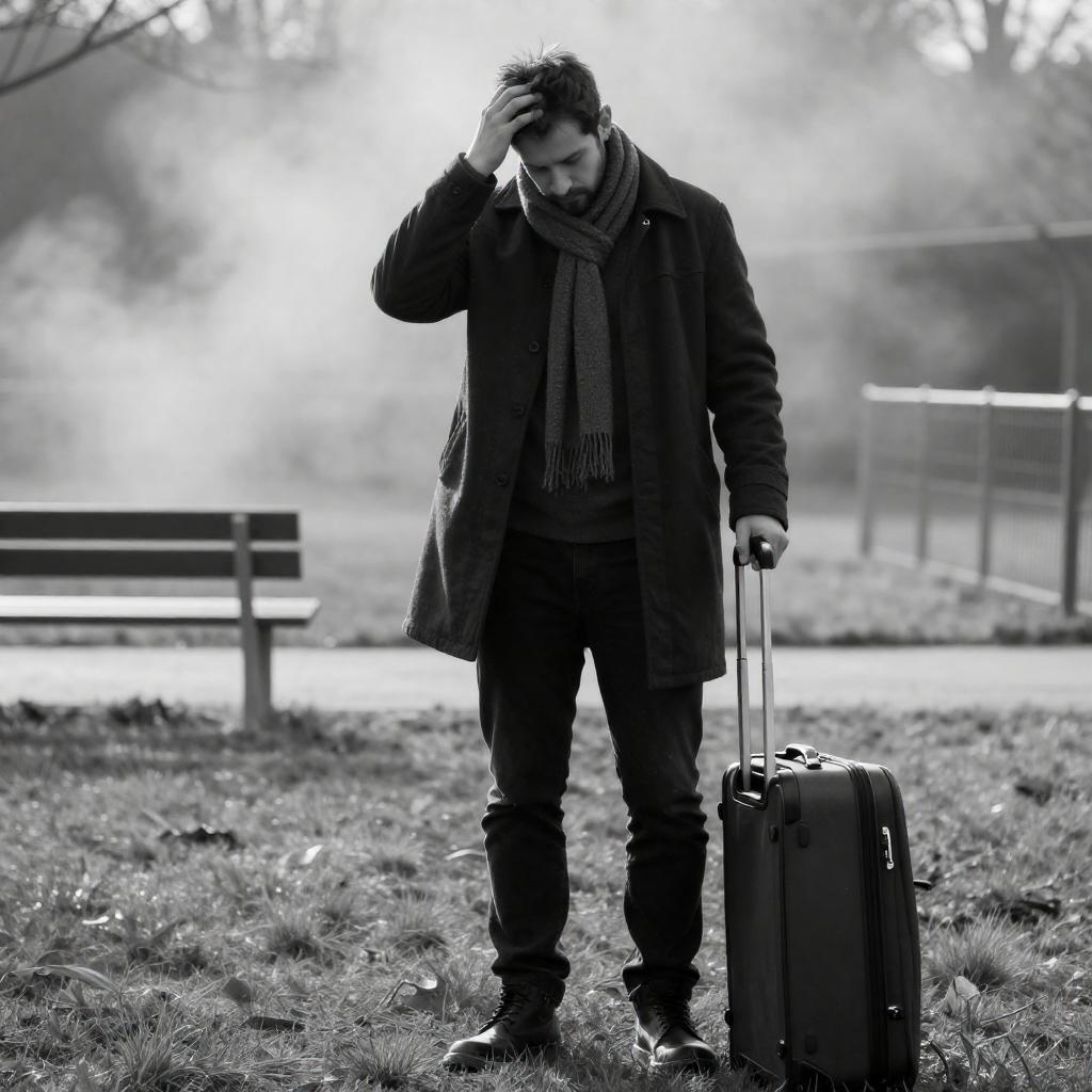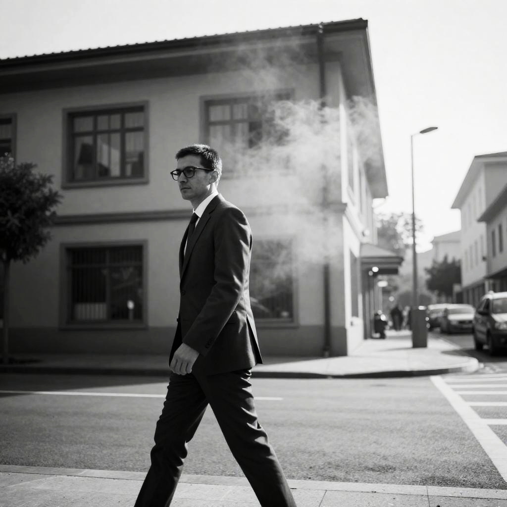 Black-and-white photograph of a man standing on a dimly lit subway platform. He is wearing a dark suit, tie, and holding a briefcase in his right hand. The man has short hair and a neutral expression. The platform has metal tracks on the left and concrete columns on the right. The background shows a tunnel extending into darkness. The man stands near the middle of the platform, looking slightly to the right.