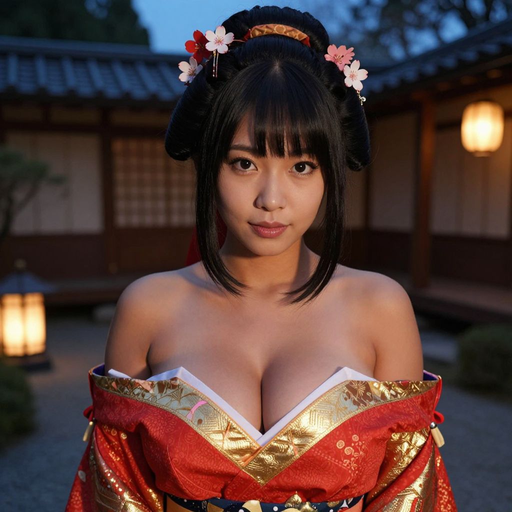 Photograph of an Asian woman with black hair, floral hairpins, and red-gold kimono, showcasing ample cleavage, standing in a traditional