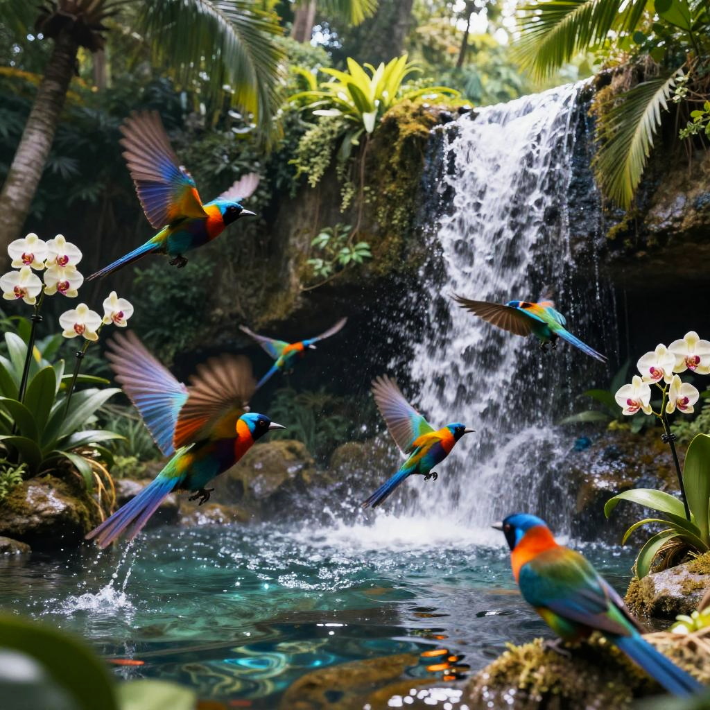 Flying tropical colorful birds congregating near a crystal-clear waterfall in a tropical paradise, vibrant feathers reflecting off the water, surrounded by blooming orchids and palm trees, cinematic lighting
