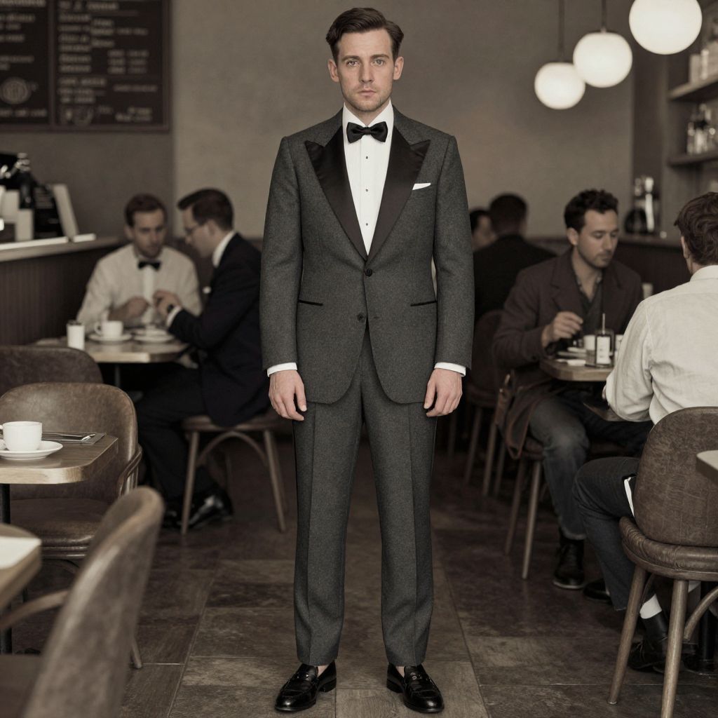 A man, charcoal gray peak lapel tuxedo, satin peak lapel, white dress shirt, black silk bow tie, black leather loafers, standing in a bustling cafe, hand-tinted photograph, confident expression. Man has masculine face and piercing eyes