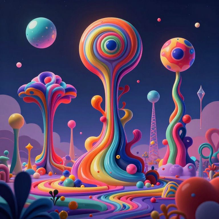 Vibrant, surreal digital art of colorful, abstract, wave-like structures with neon hues, floating orbs, and a starry night sky.