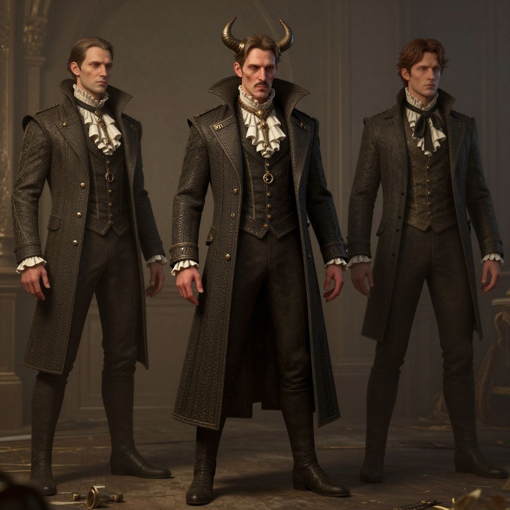 Photograph of three men standing side by side in a dimly lit, ornate room. All wear black, long, textured overcoats with high collars, white ruffled cravats, and black vests. The man in the center has dark, curved horns on his head and a stern expression. The men on the left and right have similar serious expressions. The background features dark, wooden paneling and a tall, vintage-style chair. The floor is wooden with scattered coins, adding a mysterious, Gothic atmosphere. The lighting is low, emphasizing the dark, formal attire and the central figure's horns.