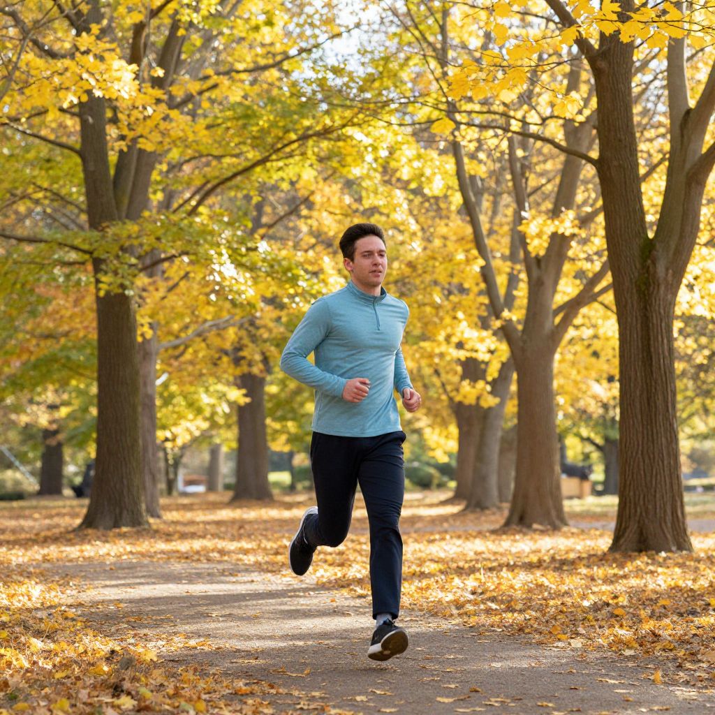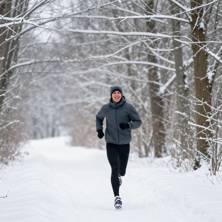 Embracing the cold embrace of winter, a solitary runner finds freedom in the rhythmic crunch of snow beneath their feet, their laughter echoing through the serene, frost-kissed forest—a testament to resilience and the enduring spirit of motion.