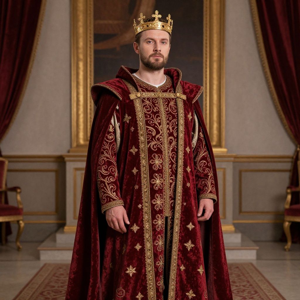 A man dressed in an elaborate red and gold medieval costume stands regally in an elegant room, wearing a golden crown that signifies royalty. The detailed costume features ornate embroidery and a rich velvet fabric, embodying a royal or noble style from the medieval period.