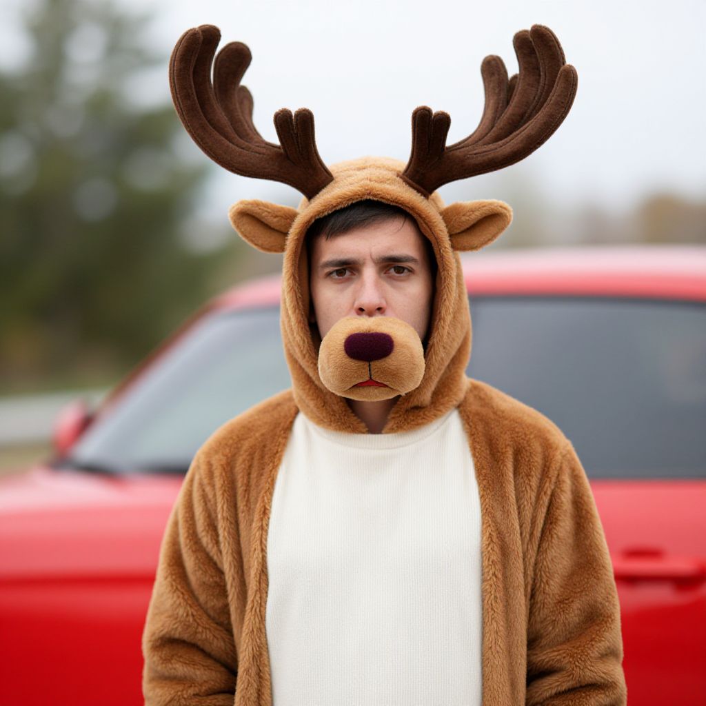 Man wearing a reindeer costume with antlers on his head. He is standing in front of a red car.