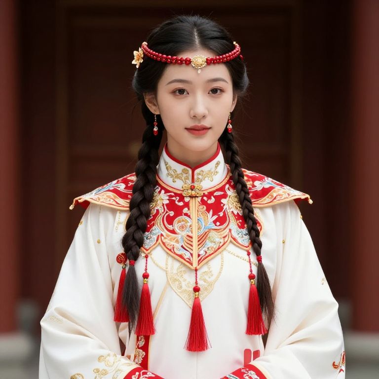 Female wearing a traditional Chinese dress with a red and gold embroidery on the front. She is wearing a headpiece with a crown and earrings. The background is blurred, but there are buildings and other objects in the background.