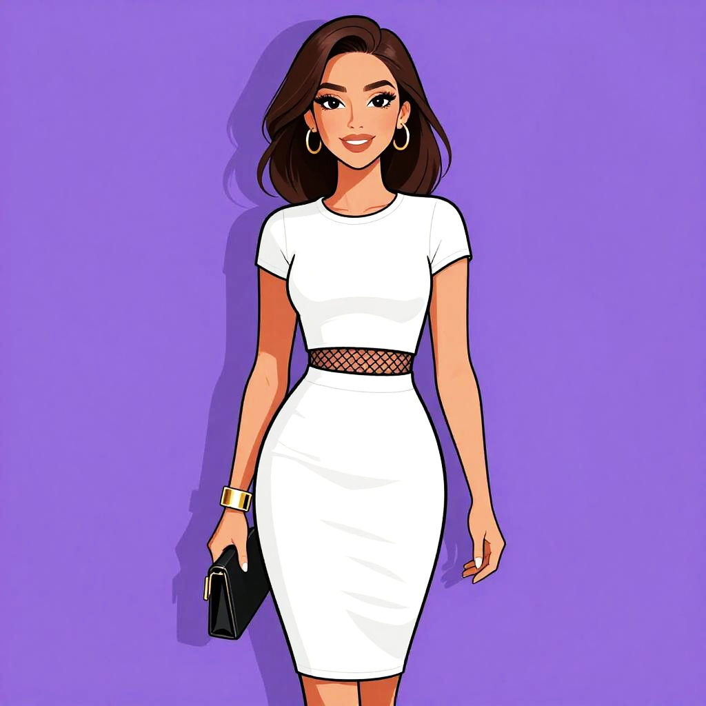 This is a digital drawing of a confident woman with long, wavy brown hair and red lipstick. She's wearing a white, sleeveless crop top and a black, high-waisted, asymmetrical skirt with a side slit. She holds a black clutch in her right hand and wears black high heels. The background is a solid purple circle, making her stand out. She has hoop earrings and a stylish, modern look.
