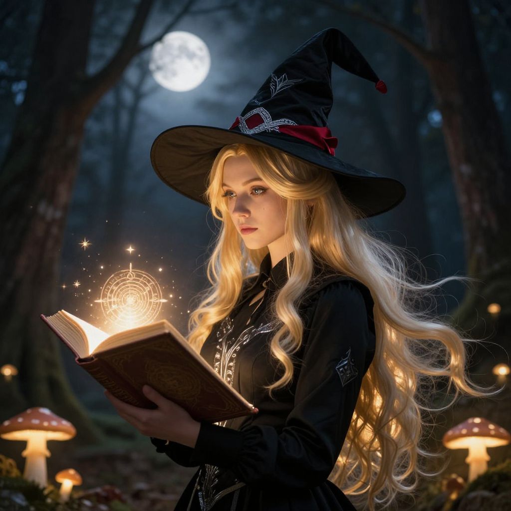 A woman with long, flowing blonde hair that gently cascades down her back, glowing with a soft golden hue under the moonlight, stands in a serene moonlit forest filled with whispering trees and glowing mushrooms. She wears a sleek black shirt with a subtle silver embroidery, and on her head rests a pointed black witch hat adorned with intricate silver trim and a single red ribbon that flutteres slightly in the breeze. In her hands, a large, ancient spellbook glows with ethereal light, its pages shimmering with arcane symbols that pulse gently. Her eyes are calm, wise, and deep with quiet knowing, reflecting the mystical energy around her. A soft, warm golden light emanates from both the witch hat and the spellbook, creating a dreamy, enchanting atmosphere that bathes the forest in a gentle, otherworldly glow. The scene is beautifully detailed, with rich textures and a sense of timeless magic, evoking a sense of wonder and balance between nature and the unseen.