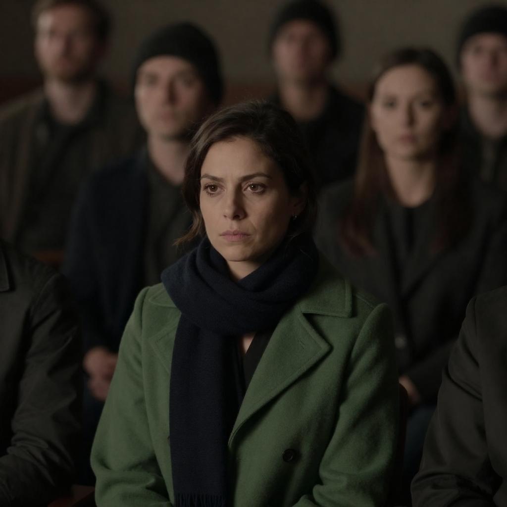 Photograph of a crowded theater audience. People of various ages, genders, and ethnicities sit closely together in dim lighting. Most have focused expressions, with a few looking slightly to the side. Dark, muted clothing. "MovieStillDB.com" in bottom right.