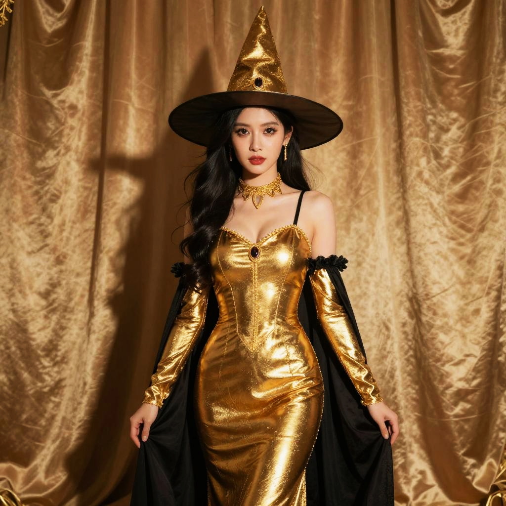 Gold Witch Costume, woman in a witch costume standing in front of a curtain