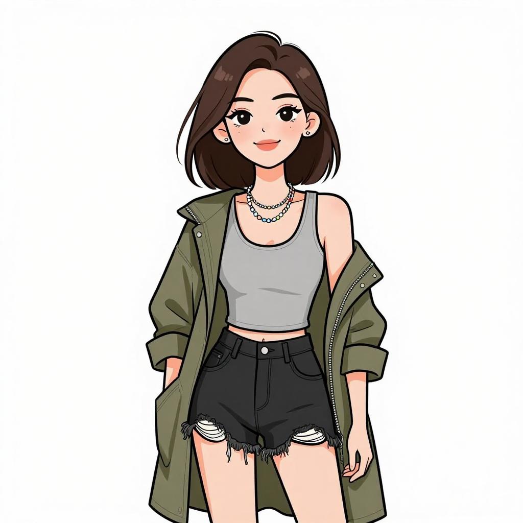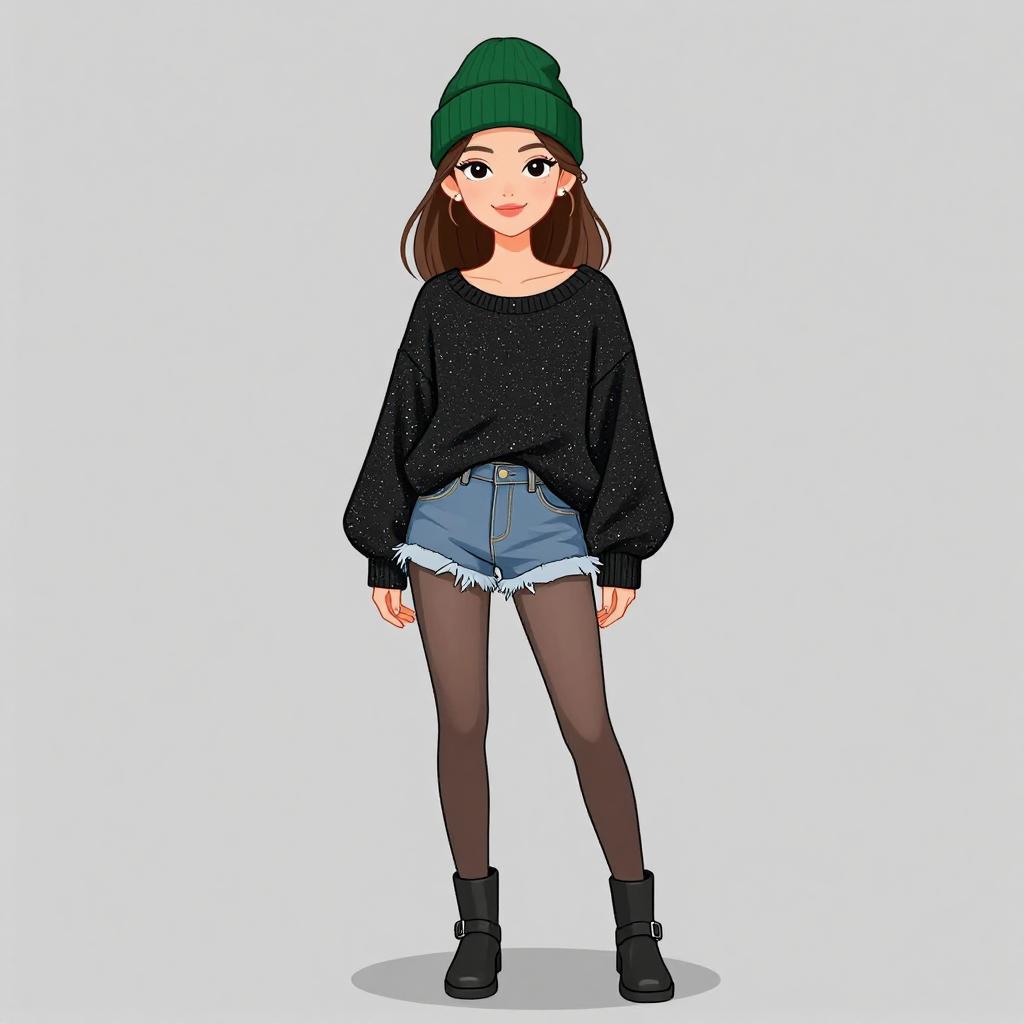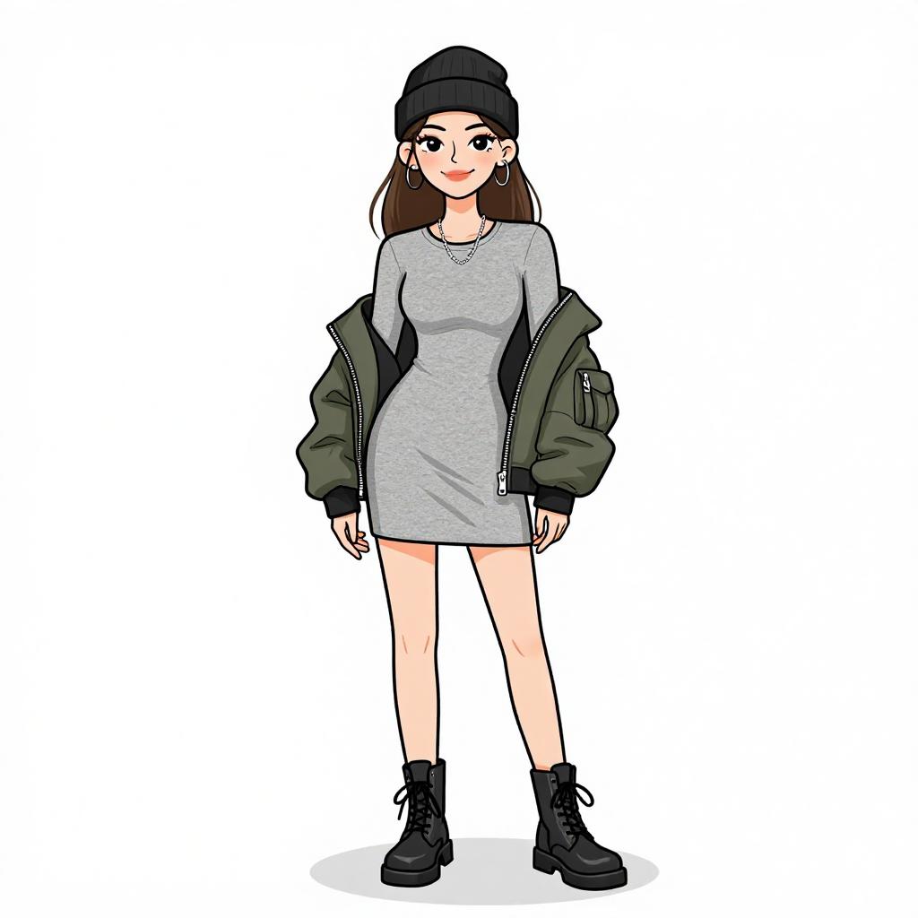 Woman with pretty face and pretty hair. smiling Woman, casual urban, heather grey long-sleeve mini dress, crew neck, relaxed fit, green bomber jacket with black cuffs draped over shoulders, black combat boots with lace-up fronts, simple silver necklace, black beanie, white studio background --sref 1467