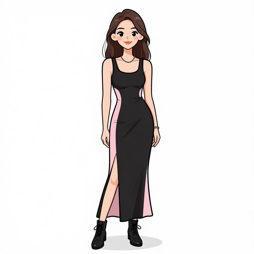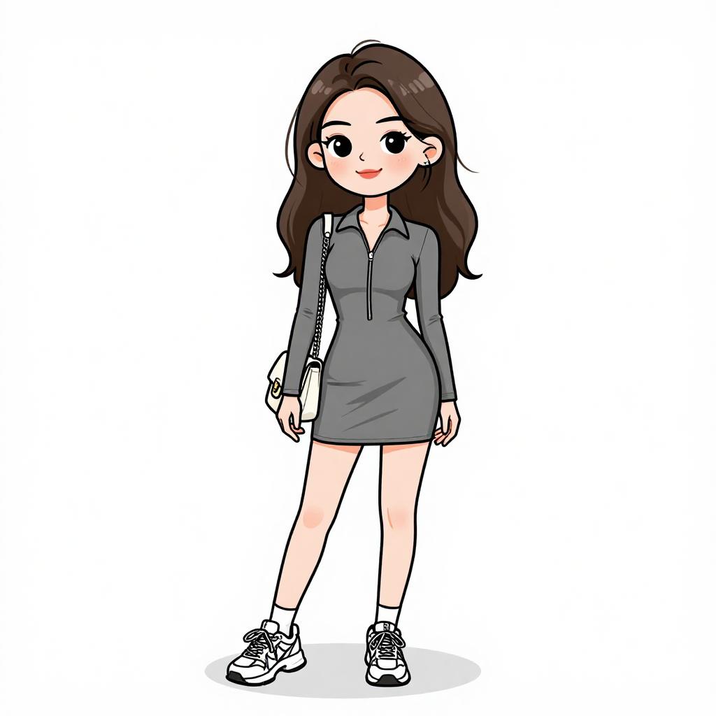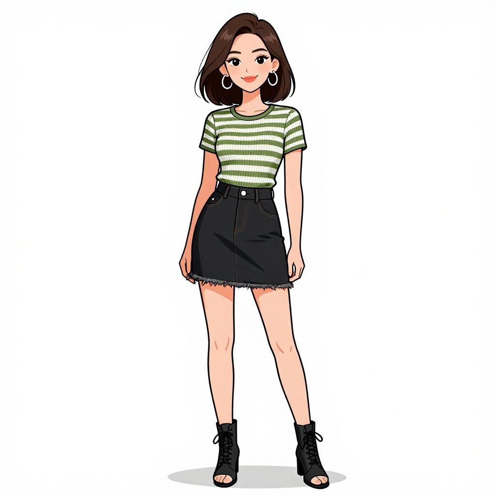 Woman with pretty face and pretty hair. smiling Woman, casual urban, heather grey long-sleeve mini dress, crew neck, relaxed fit, green bomber jacket with black cuffs draped over shoulders, black combat boots with lace-up fronts, simple silver necklace, black beanie, white studio background --sref 1467