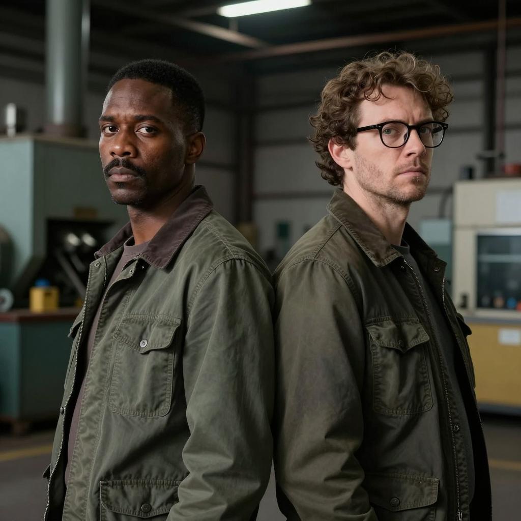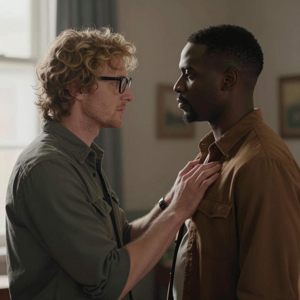 Bald black man with a silver earring, ured brown shirt, facing another bald white man in a dark shirt, inside a dimly lit bar with red and blue lights, bar shelves in background. Both men have serious expressions.