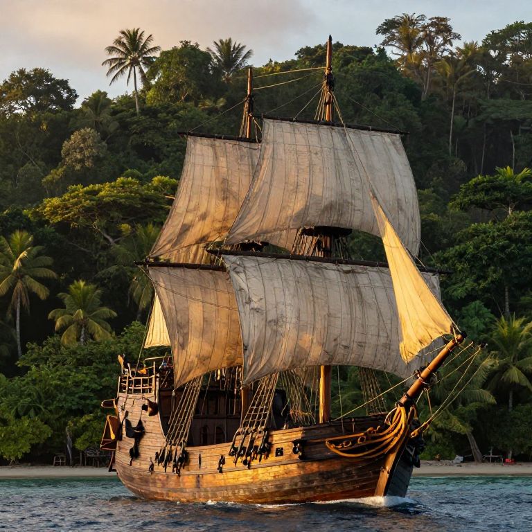 Reales historical ship setting sail on a vast ocean under a fiery sunset, detailed sails catching the wind, crew working diligently, waves crashing with dynamic motion, capturing the spirit of exploration and maritime adventure in high detail