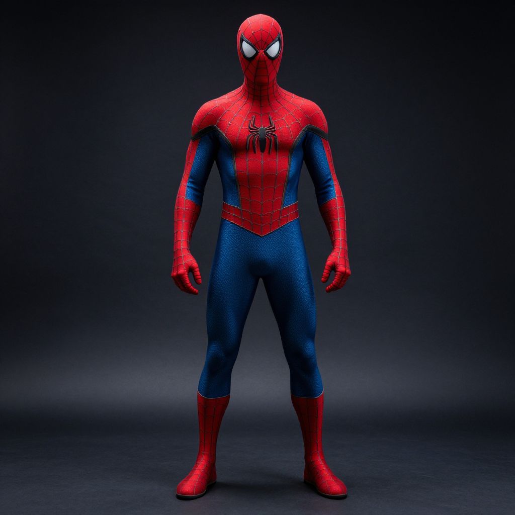 Photorealistic CGI of Spider-Man standing, facing forward. Wearing red and blue spider-web patterned suit, red boots, and mask with white