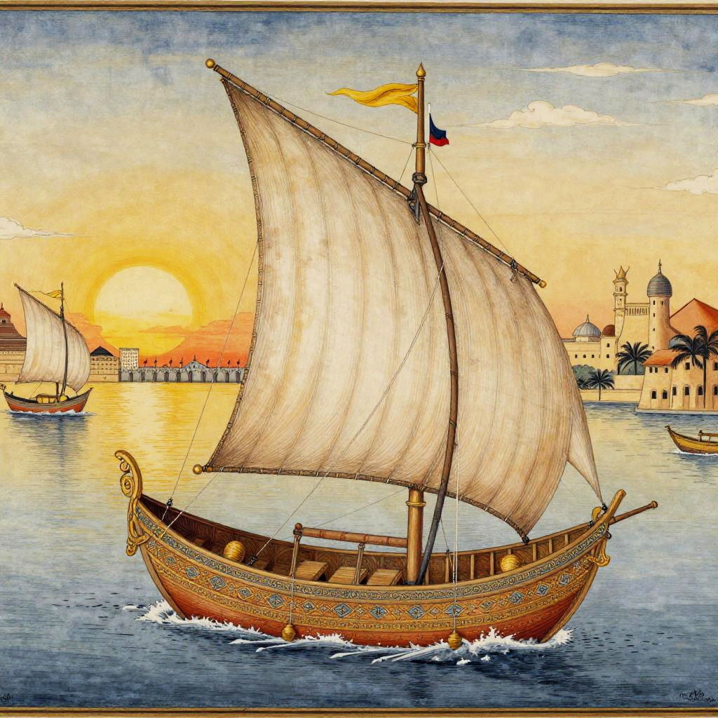 A Mughal miniature style ink wash painting, illustrating an ornate Arabian dhow with billowing sails sailing into a golden Arabian Gulf port at sunset.