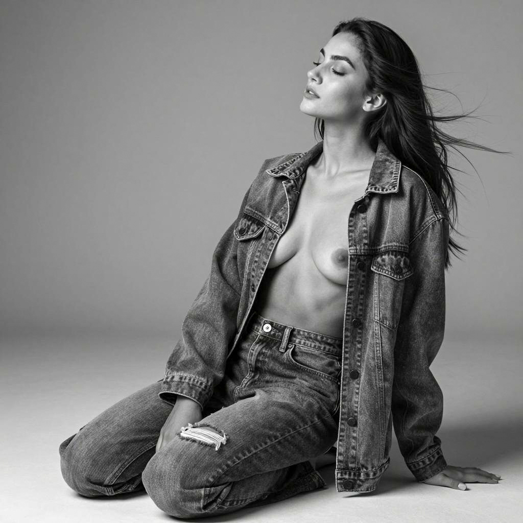 Black-and-white photo of a slim young woman with dark wet hair wearing a wet, semi-transparent white tank top, revealing her nipples, paired with unbuttoned denim jeans and black underwear. She stands in profile against a plain light background, her skin glistening with moisture.