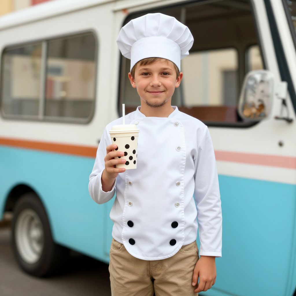 "kid ice cream truck costume, 1boy, male focus, solo, hat, holding, cup, smile, holding cup, polka dot, old, train, white headwear, chef hat, buttons, facial hair, long sleeves, old man, pants, looking at viewer Realistic photo of casual sexy person with pretty face"
