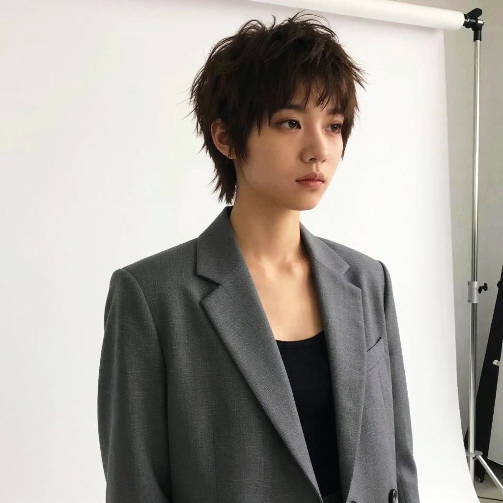 Short Shag hairstyle on young woman, wearing modern suit, in indoor studio, captured in fashion editorial style with bright light.