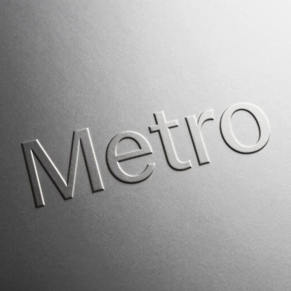 Close-up of Metro font characters embossed on a metallic surface, minimalist design with sharp edges, subtle shadows, elegant monochrome palette, contemporary graphic design setting