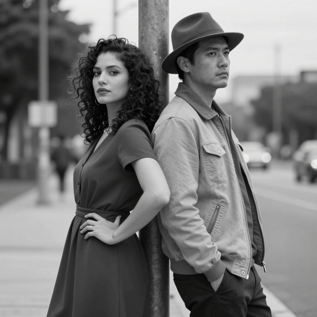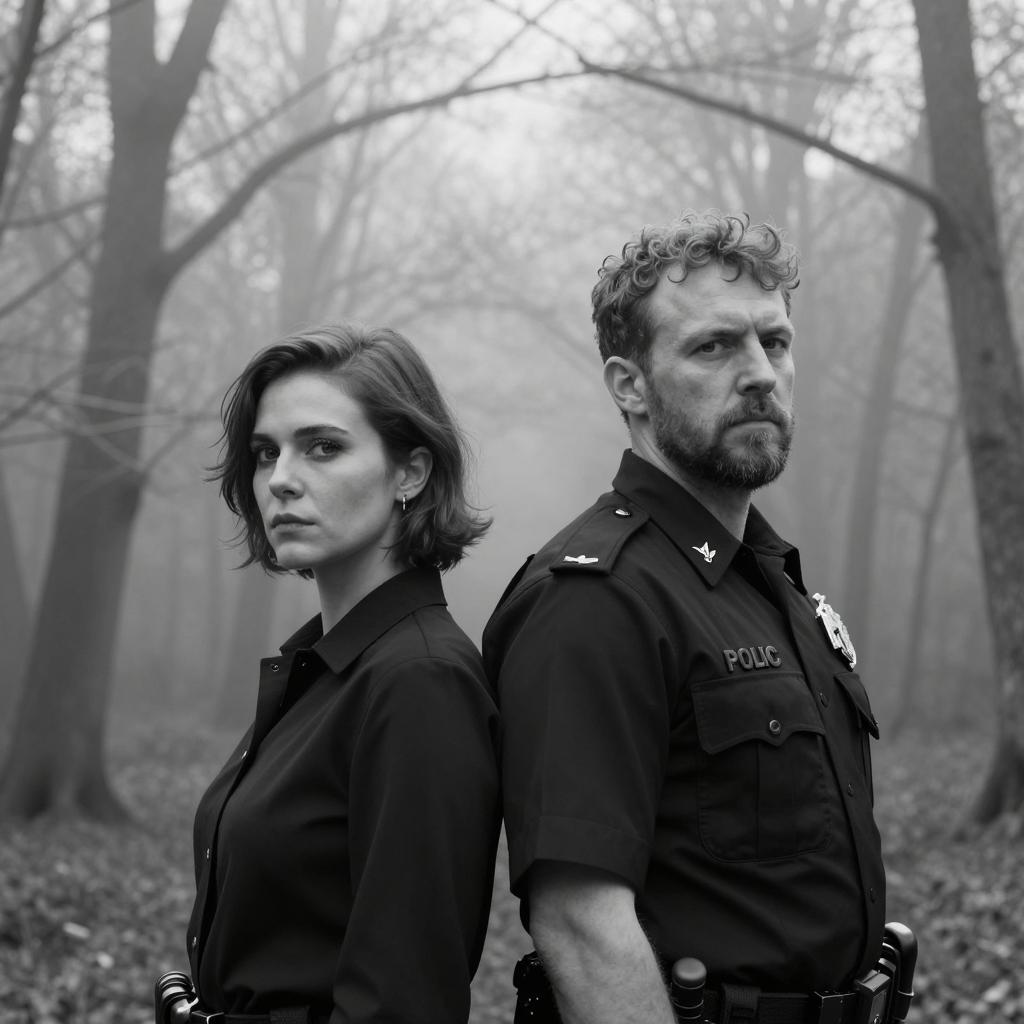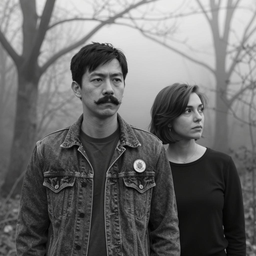 Black and white photograph of two people in a forest with leafless trees. Man in denim jacket with badge, mustache, short black hair, looking forward. Woman in dark top, short brown hair, standing behind him, looking to the side. Misty background. Man on left, woman on right. Both have serious expressions. Two bare trees on left and right.