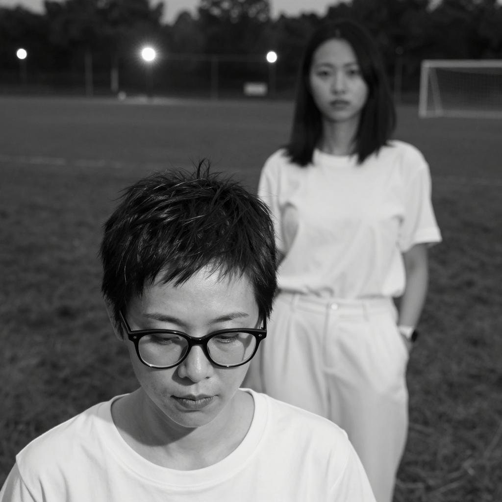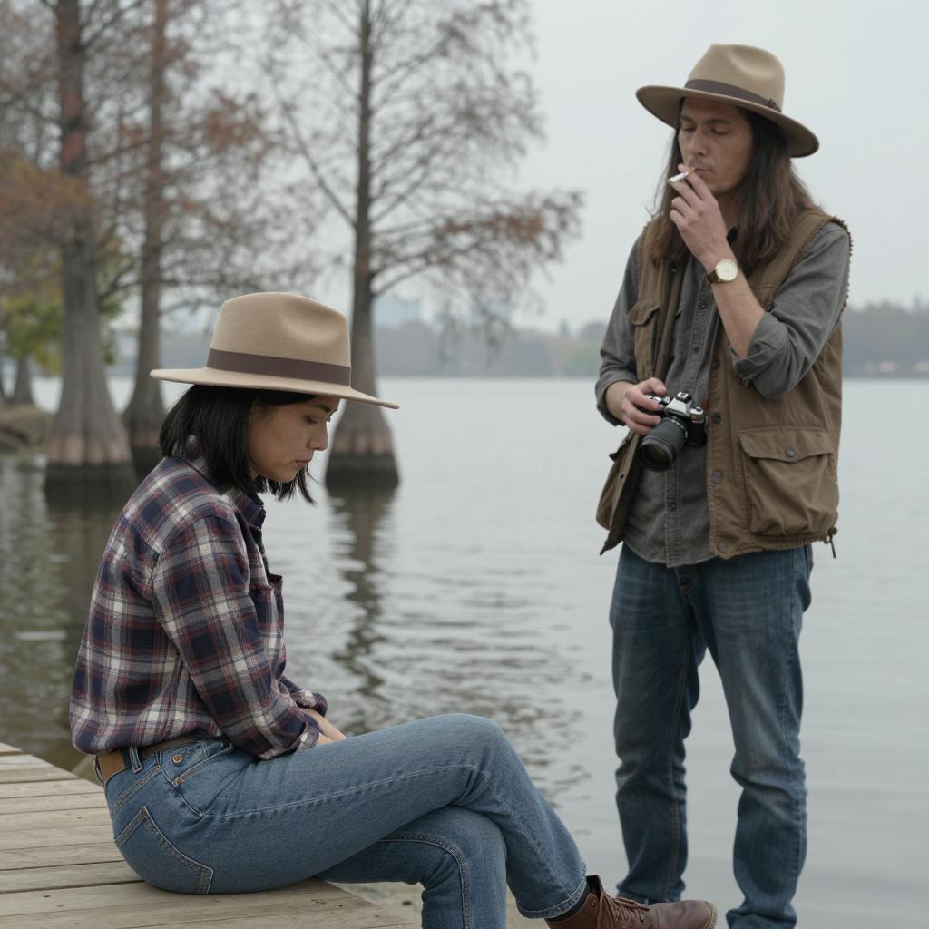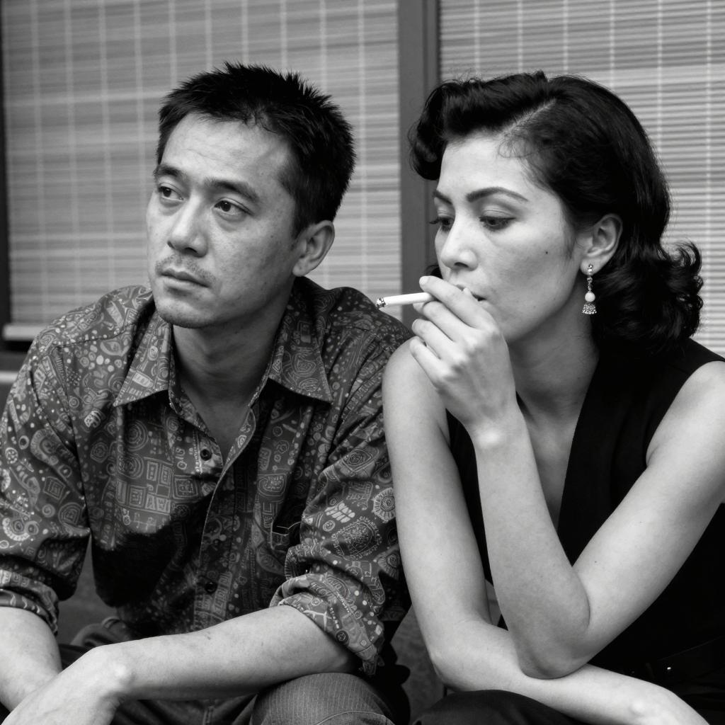 Black and white photograph of two people in a forest with leafless trees. Man in denim jacket with badge, mustache, short black hair, looking forward. Woman in dark top, short brown hair, standing behind him, looking to the side. Misty background. Man on left, woman on right. Both have serious expressions. Two bare trees on left and right.