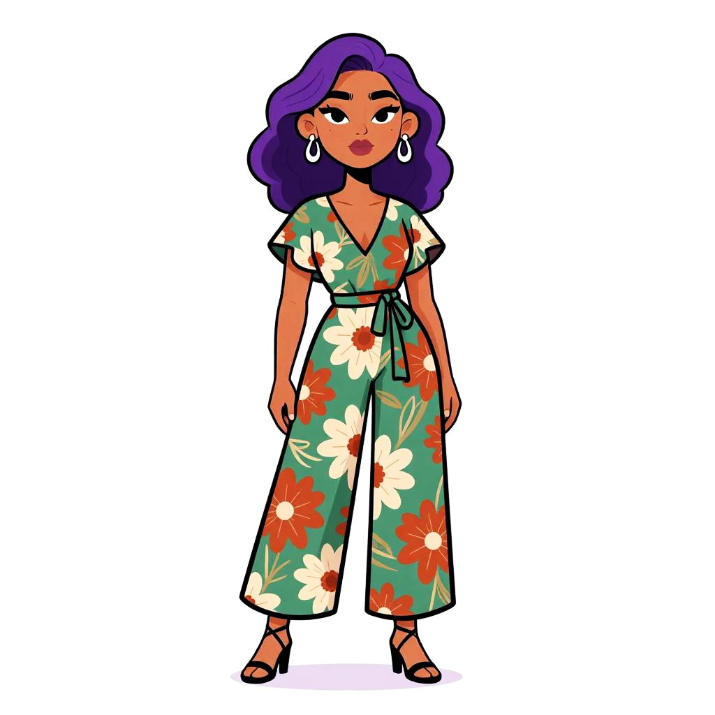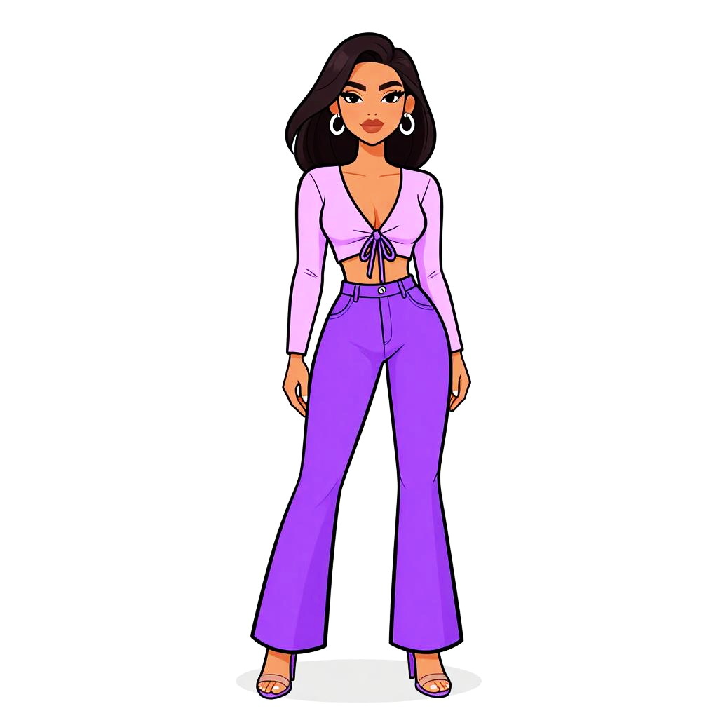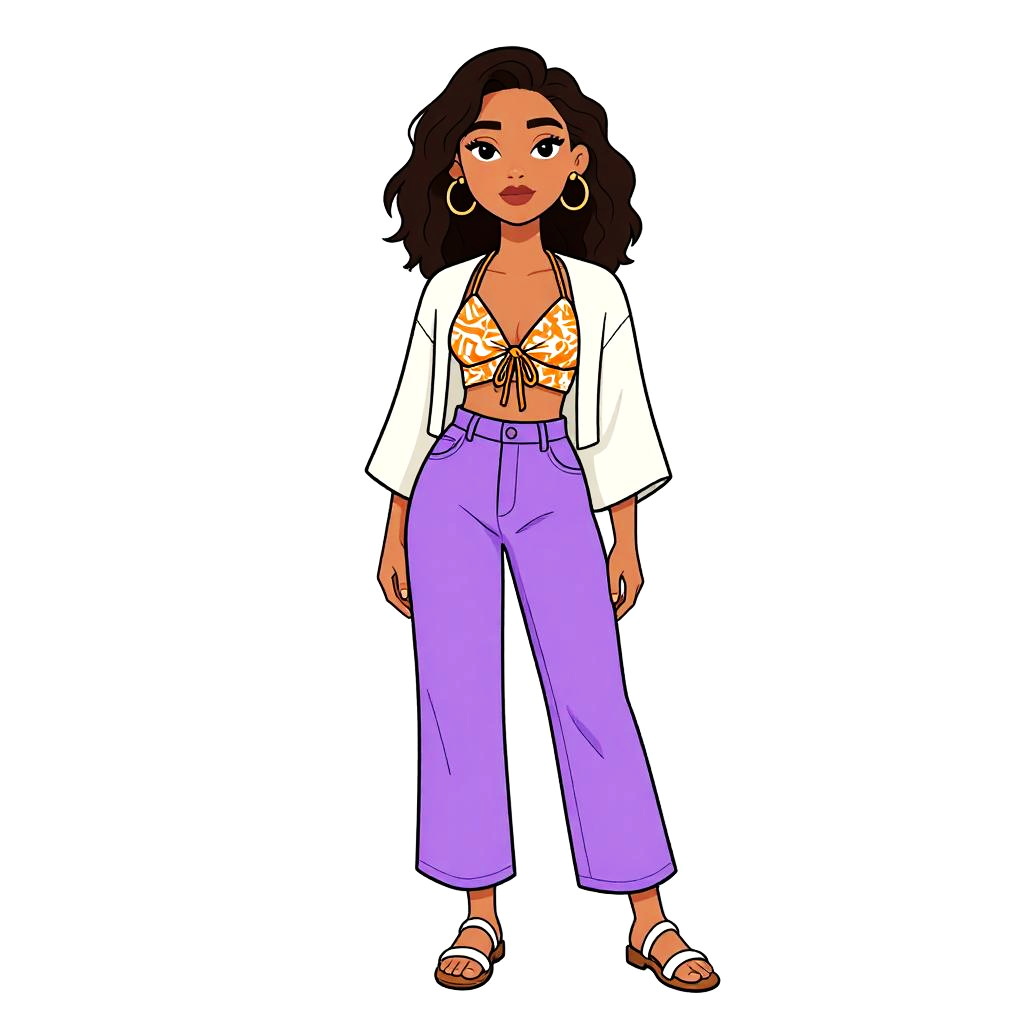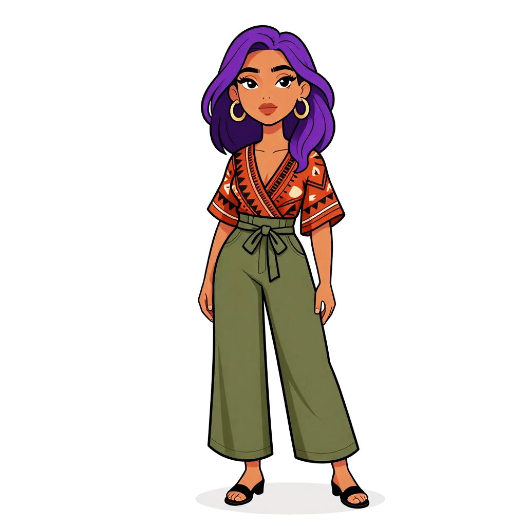 Woman with pretty face and pretty hair. Woman, bohemian chic, patterned wrap top in burnt orange with black geometric designs, V-neck, short sleeves, high-waisted wide-leg pants in olive green, fabric belt with bow, peep-toe black flat sandals, plain white studio background. --sref 1467