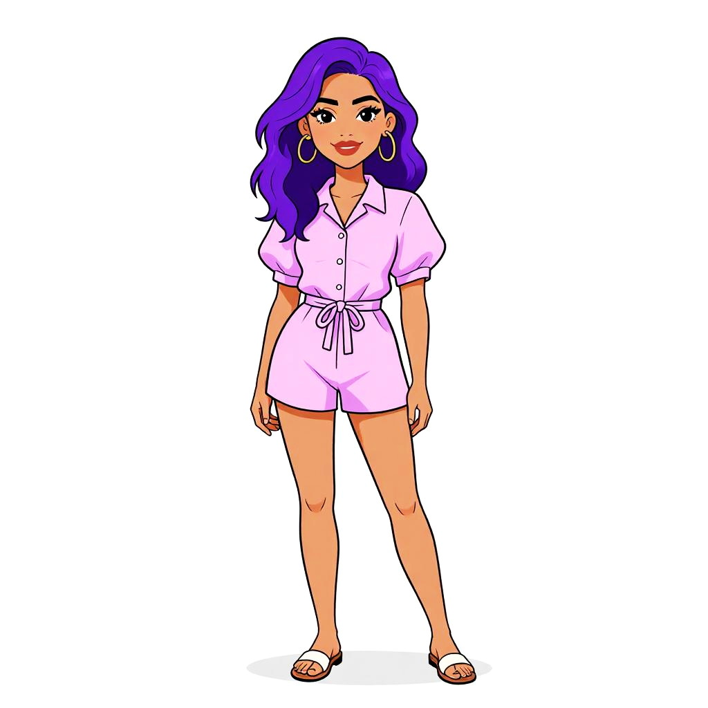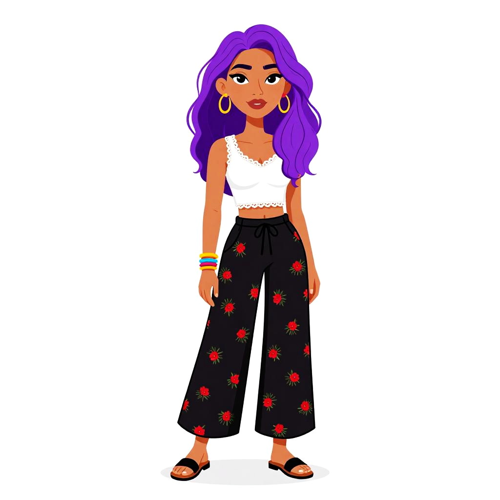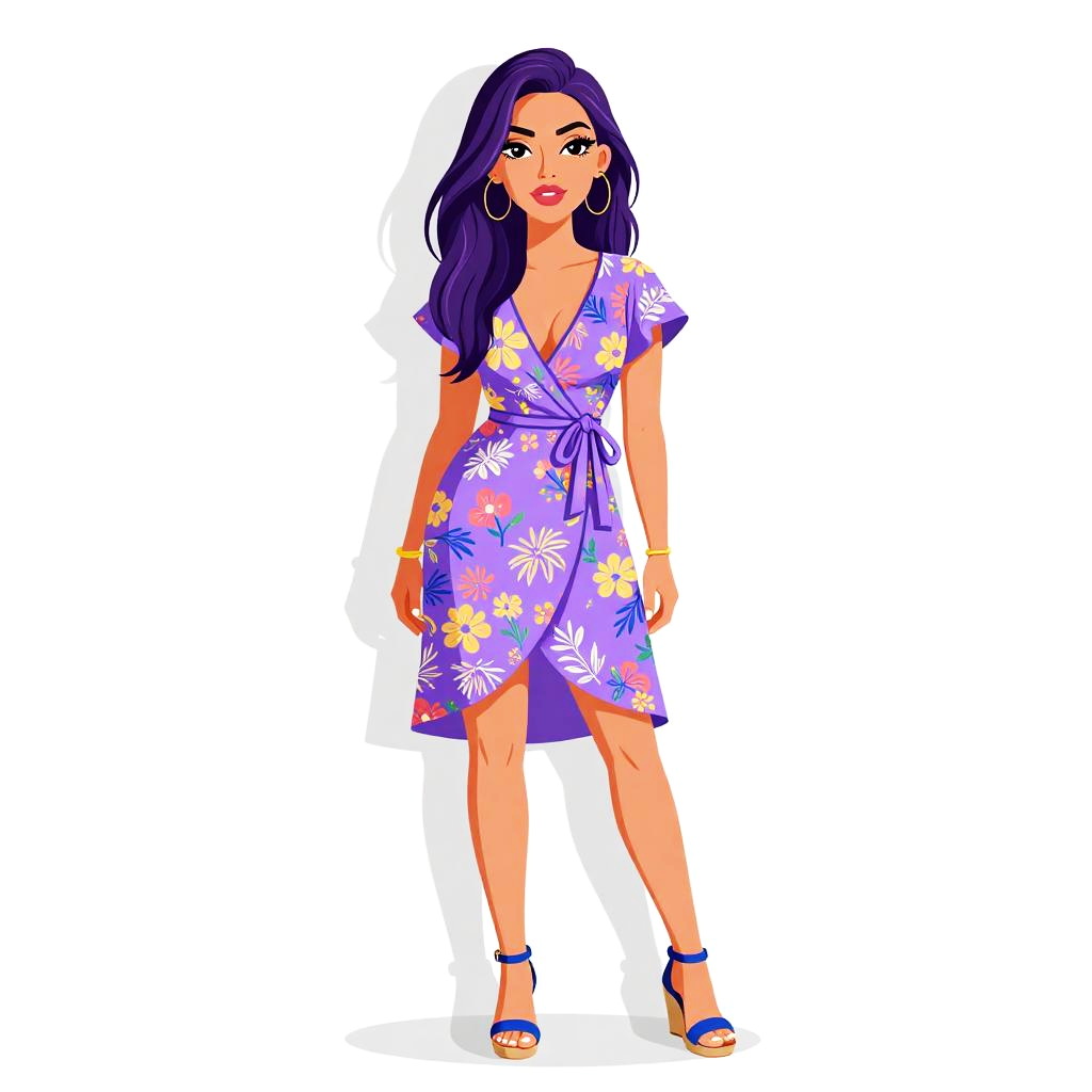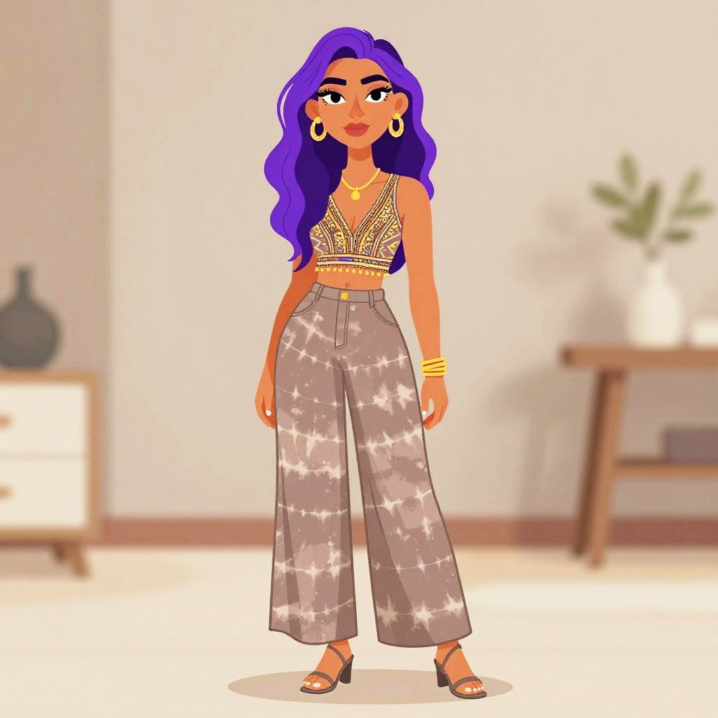 Woman with pretty face and pretty hair. Woman, bohemian chic, patterned wrap top in burnt orange with black geometric designs, V-neck, short sleeves, high-waisted wide-leg pants in olive green, fabric belt with bow, peep-toe black flat sandals, plain white studio background. --sref 1467