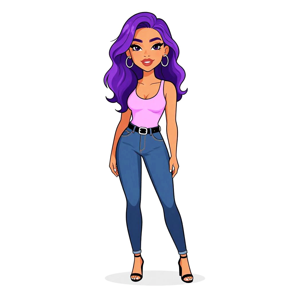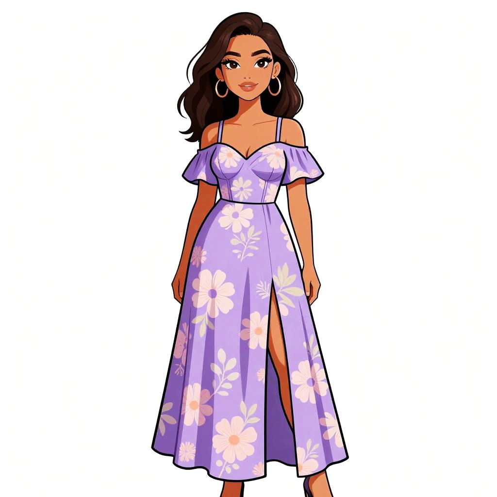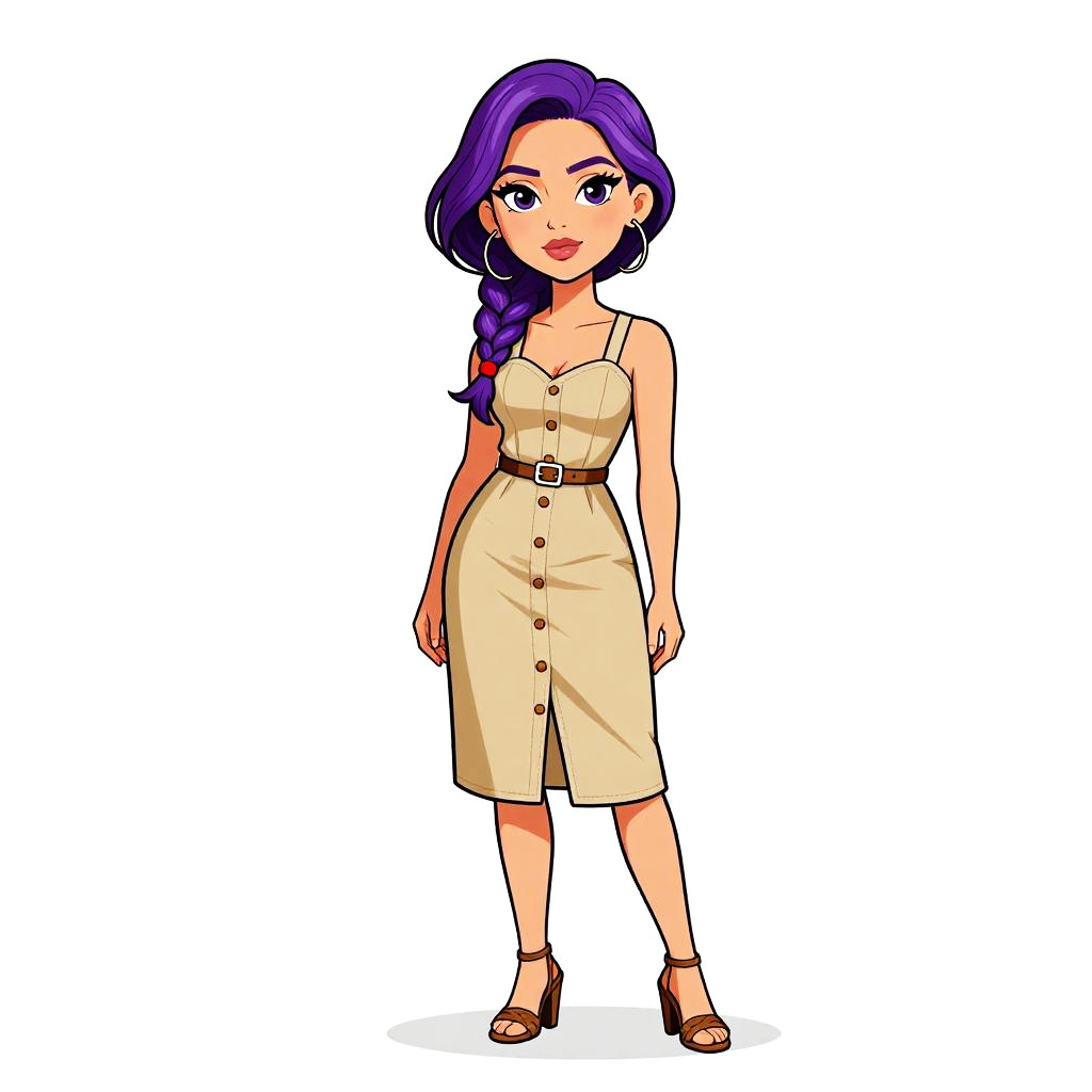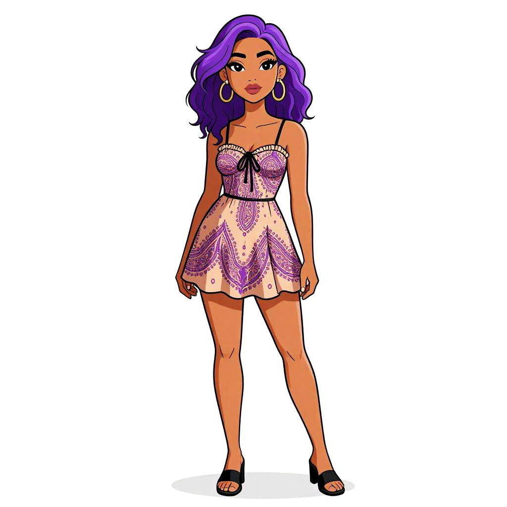 Woman with pretty face and pretty hair. Woman, bohemian chic, patterned wrap top in burnt orange with black geometric designs, V-neck, short sleeves, high-waisted wide-leg pants in olive green, fabric belt with bow, peep-toe black flat sandals, plain white studio background. --sref 1467
