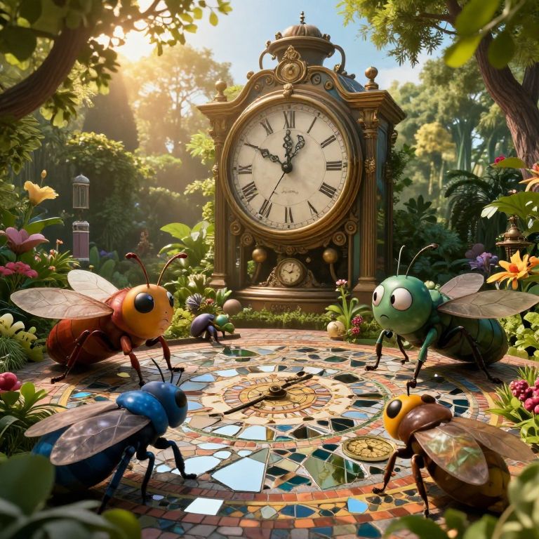This vibrant, CGI image depicts a whimsical garden scene with four oversized, colorful, cartoonish insects with translucent wings gathered around an ornate, antique clock. The clock, with Roman numerals and gold detailing, stands in the background, surrounded by lush greenery and blooming flowers. The mosaic-tiled ground is colorful and patterned. Sunlight filters through the trees, casting a warm, dappled glow over the scene. The insects are brightly colored—red, blue, green, and yellow—and have exaggerated, expressive eyes. The garden is lush with various plants and flowers, creating a magical, fairy-tale-like atmosphere.