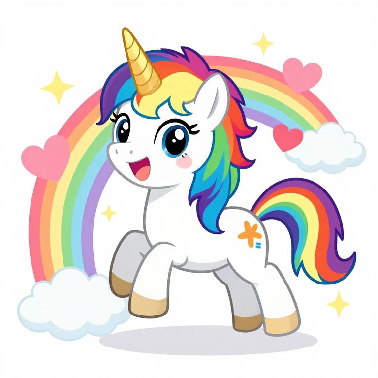 The image features a charming, happy, and colorful cartoon unicorn falling in love, set against a white background. The unicorn, with a golden horn and a rainbow-colored mane and tail, exudes a sense of joy and playfulness. It is depicted in an anime style, with exaggerated features and a cheerful expression. The unicorn is surrounded by a vibrant rainbow, adding a sense of wonder and magic to the scene. Floating clouds and hearts, along with stars, enhance the whimsical atmosphere. The overall composition is dynamic, with the unicorn positioned centrally, drawing the viewer's attention to its joyful demeanor. The interplay of colors, textures, and shapes creates a visually appealing and enchanting scene.