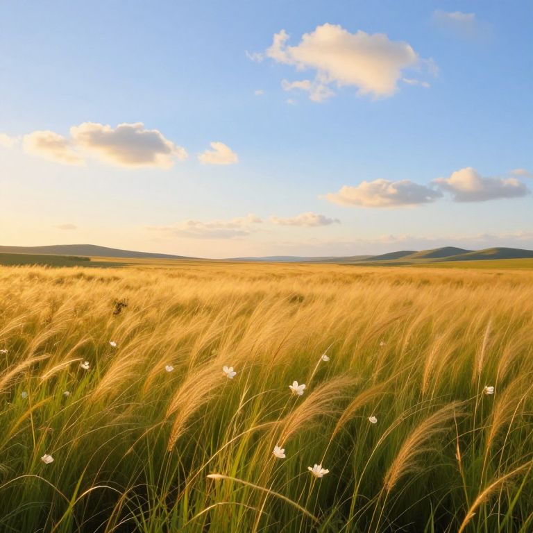 Photograph of a serene, golden prairie at sunset. Tall, wispy grasses with delicate white flowers sway gently in the foreground. The background features a rolling, green landscape under a vibrant blue sky with scattered, fluffy white clouds. The sunlight bathes the grass in warm, golden hues, creating a tranquil and picturesque scene. The horizon is slightly elevated, with distant hills adding depth to the landscape. The overall mood is peaceful and natural, capturing the beauty of the countryside.