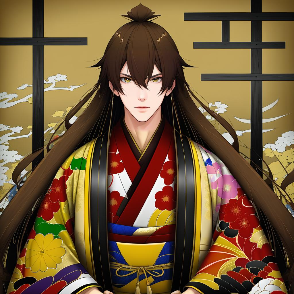This digital anime-style illustration depicts a tall, androgynous character with long, dark brown hair tied in a small topknot. The character has pale skin, sharp yellow eyes, and a serious expression. They wear a vibrant, traditional Japanese kimono adorned with colorful floral patterns, including red, yellow, and green flowers. Two black shide (paper sliding doors) are in the background against a golden-brown gradient, with white clouds adding depth. The character's kimono features a yellow obi (sash) with blue and white accents. The overall style is clean and detailed, emphasizing the character's serene yet intense presence.
