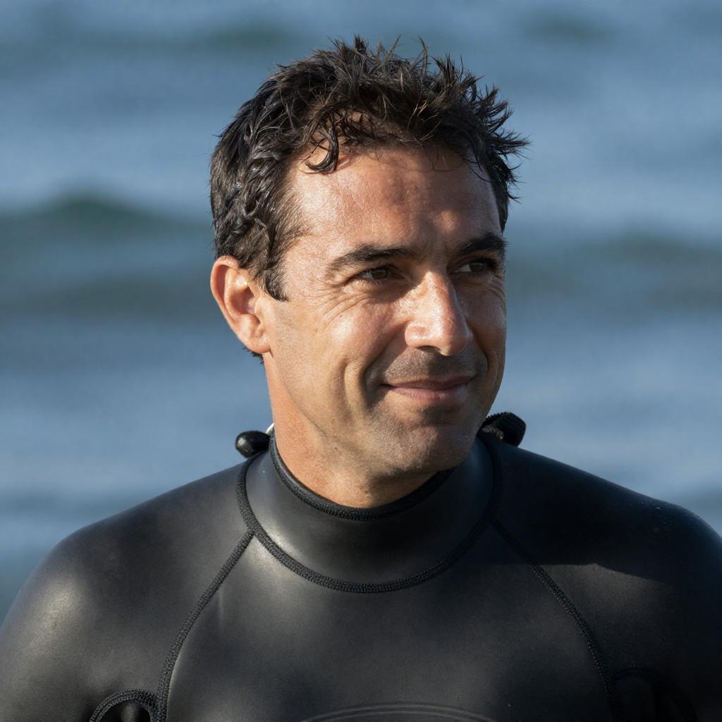 Photograph of a middle-aged man with short, dark brown hair and light skin, wearing a black wetsuit. He has a slight smile and is looking to the right. The background shows a blurred, blue ocean. His wetsuit has a shiny ure, and the lighting highlights his facial features.