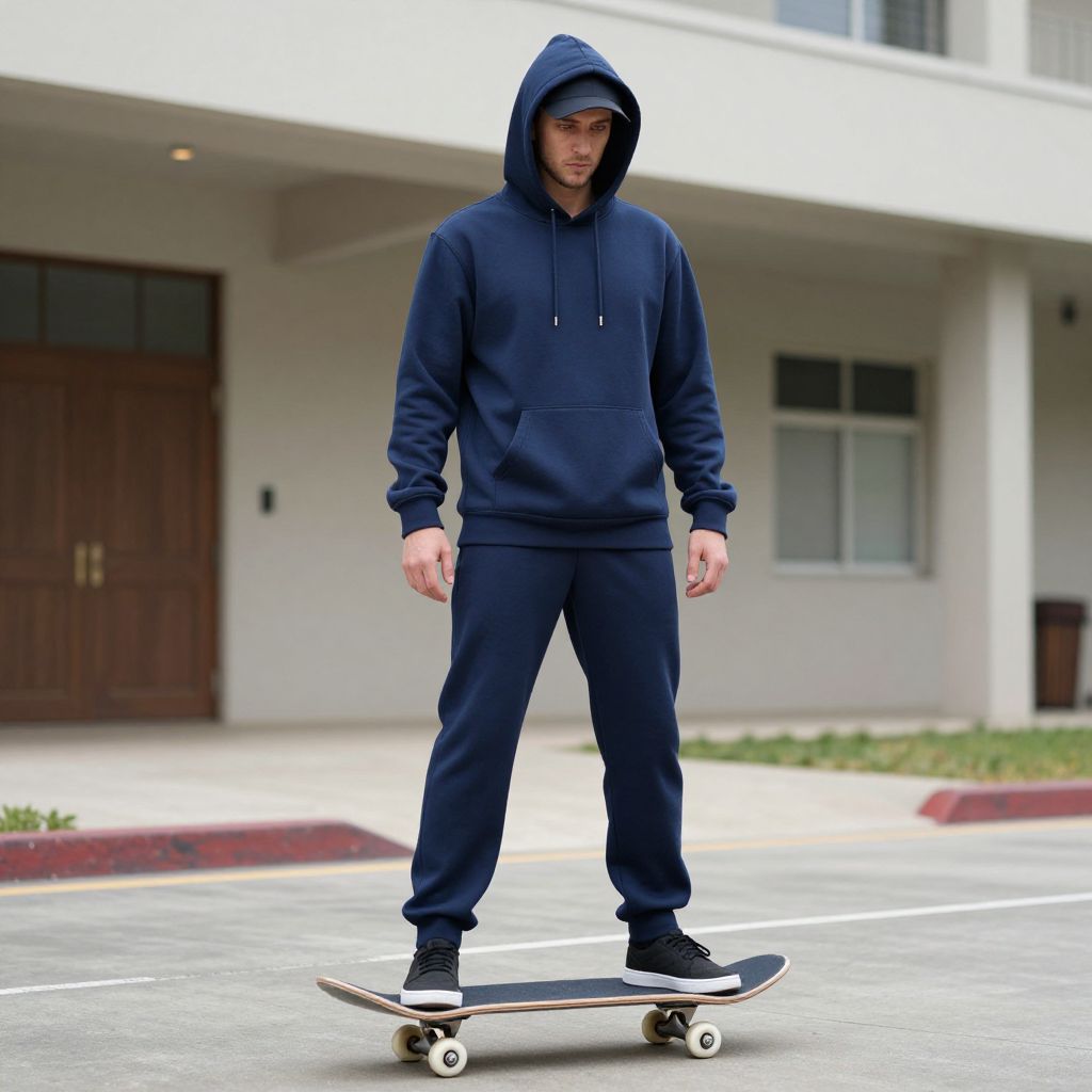 Photograph of a young man standing on a skateboard in a suburban parking lot. He is wearing a dark blue hooded sweatshirt, matching sweatpants, and black sneakers. His hood is up, partially obscuring his face. The background shows a white building with large windows and a red double-door entrance. The pavement is gray with white parking lines. The skateboard has a black deck with white wheels. The man's stance is relaxed, with his hands by his sides. The overall mood is casual and urban.