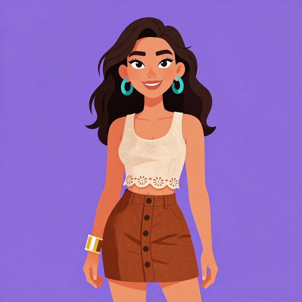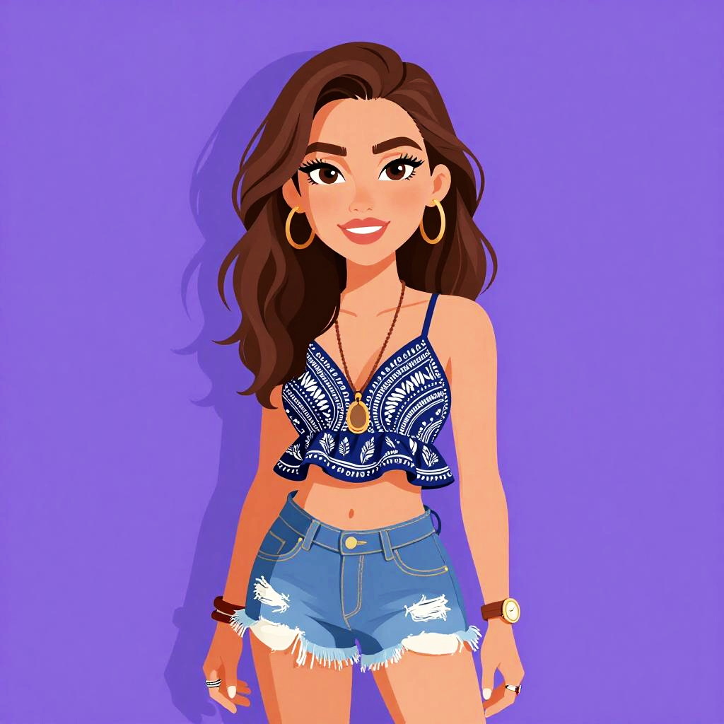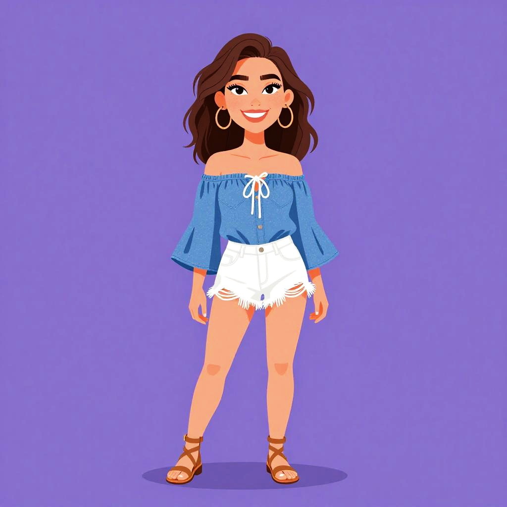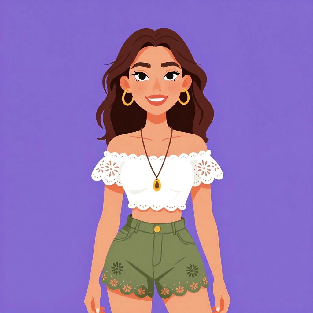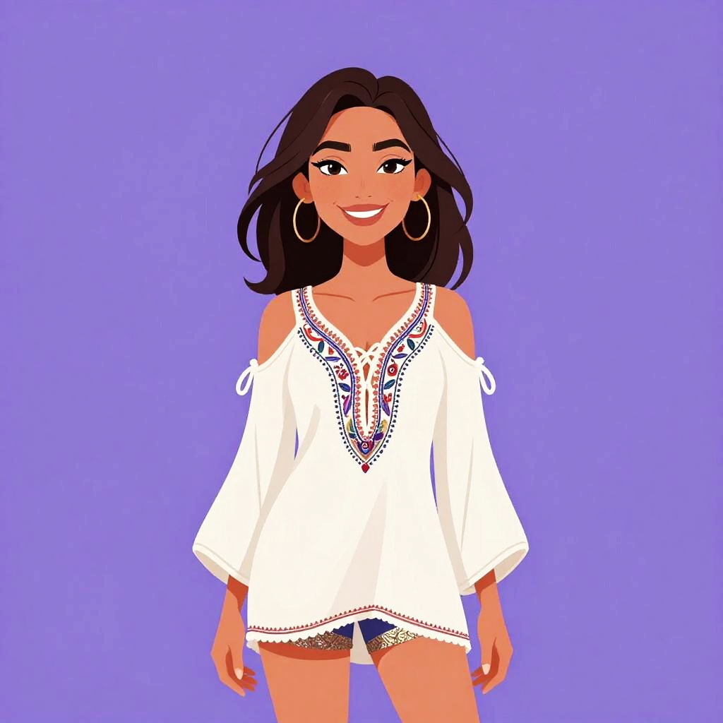 Woman with pretty face and pretty hair. smiling Woman, bohemian style, white cold-shoulder tunic with intricate embroidery on the chest, flowing long sleeves with tie-up details at the shoulders, short uneven hemline, visible metallic patterned shorts underneath, plain background. --sref 1467