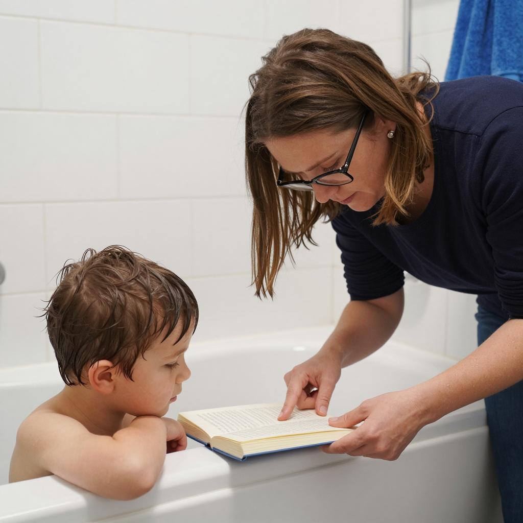 Woman with dark hair, wearing a black top, sits on a bed beside a young boy with blond hair, wearing a red and white checkered pajama top. Blue circular light frames their faces. Woman's right hand on boy's left arm. Boy smiles slightly. Bed has white and yellow blanket. Oval window in background.