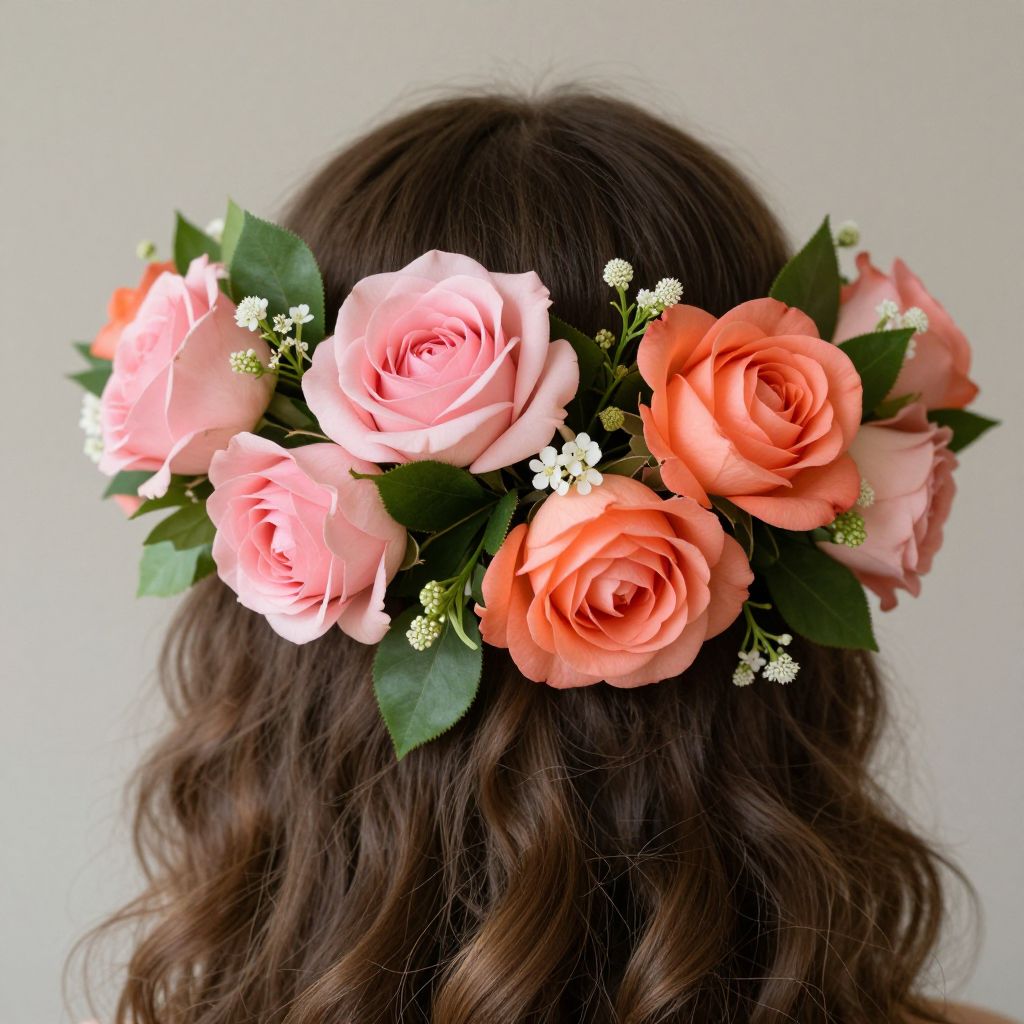 Elegant floral headpiece adorning a woman's hair, featuring six vibrant roses—three in soft pink, two in coral, and one in warm orange—interspersed with lush green foliage and delicate white buds, creating a harmonious and natural crown-like arrangement.