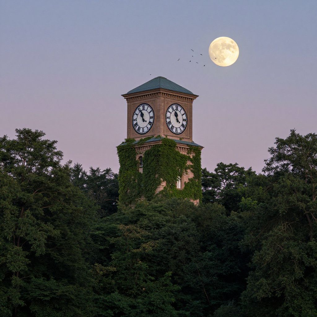 Towering clock tower, cloaked in lush greenery, stands amidst a serene forest, its three faces adorned with Roman numerals, as a flock of birds soars gracefully around a luminous full moon in the twilight sky.