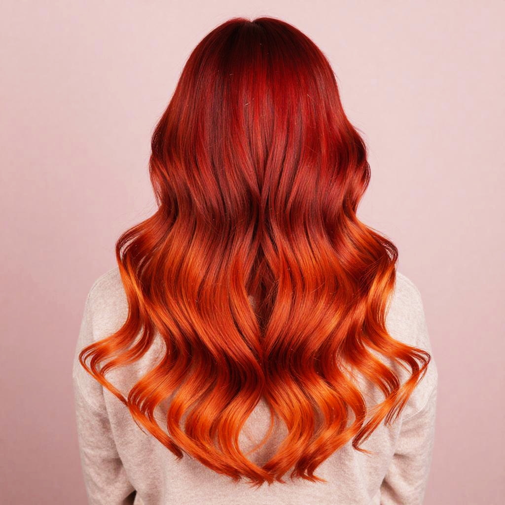 Red to orange ombre hair flowing in gentle waves, set against a soft, pastel background, capturing the vibrant transition from fiery red roots to bright orange tips, with a subtle shine and natural texture, high detail, fantasy style.