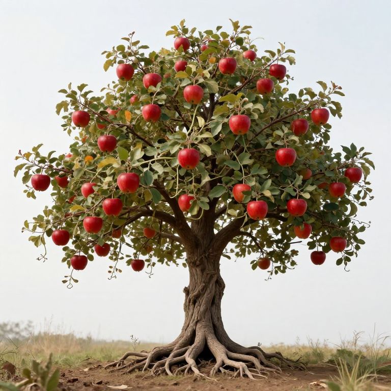 A majestic tree stands rooted firmly in the earth, its branches adorned with vibrant red apples suspended by delicate vines, defying gravity in a surreal display of nature's whimsy.