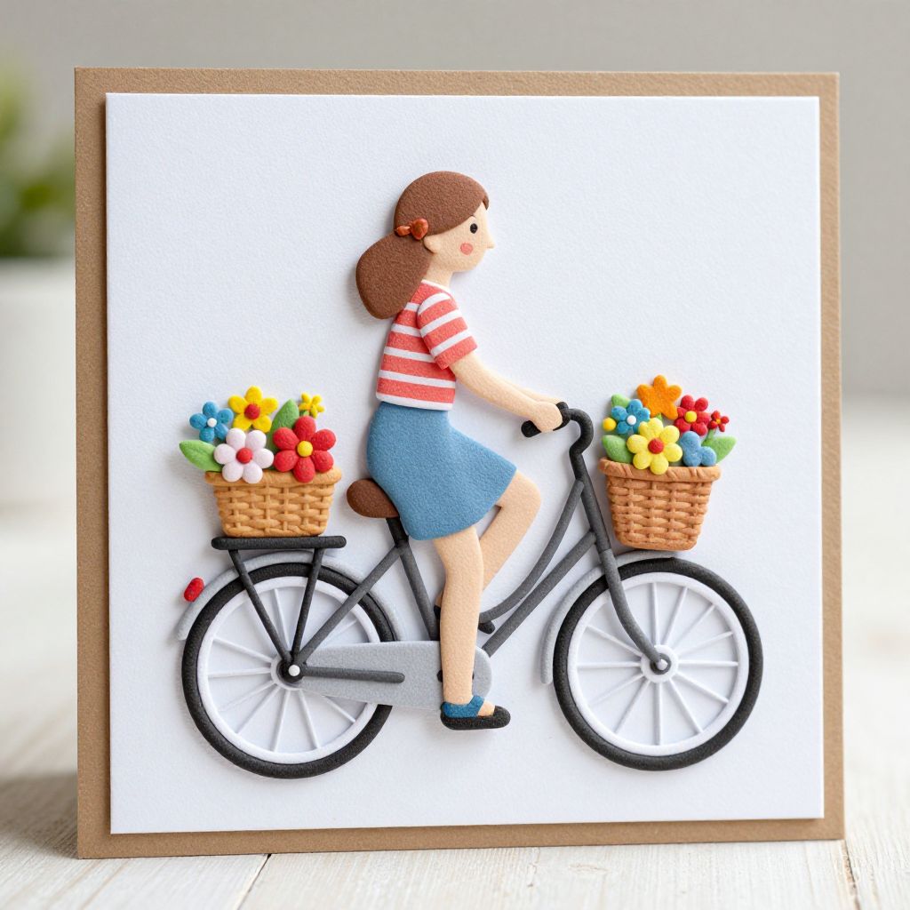 A charming 3D decoupage greeting card featuring a handcrafted illustration of a woman riding a bicycle adorned with vibrant baskets of flowers, perfect for celebrating birthdays or expressing affection for loved ones like mums, sisters, daughters, nieces, or aunts.