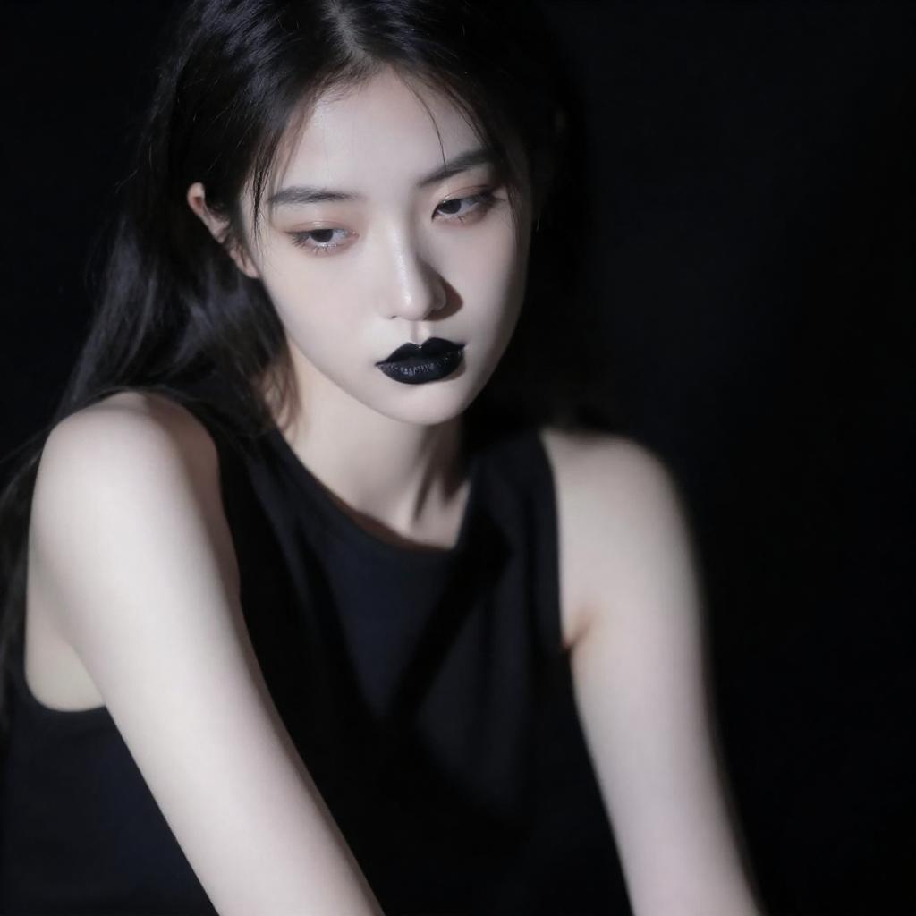 Photograph of a young woman with long, messy blonde hair and pale skin, wearing a yellow jacket over a black shirt. She has dark, smudged makeup around her eyes and a neutral expression. The background is completely black, making her the focal point. Her hair and jacket are illuminated, creating a stark contrast.