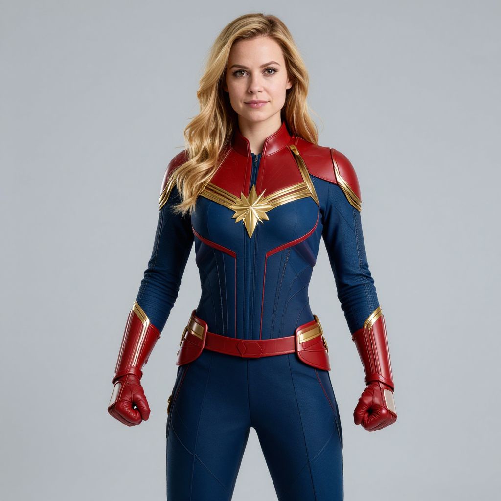 A powerful portrayal of Captain Marvel, this superhero embodies strength and determination, clad in her iconic suit ready for action, making it an ideal cosplay idea.