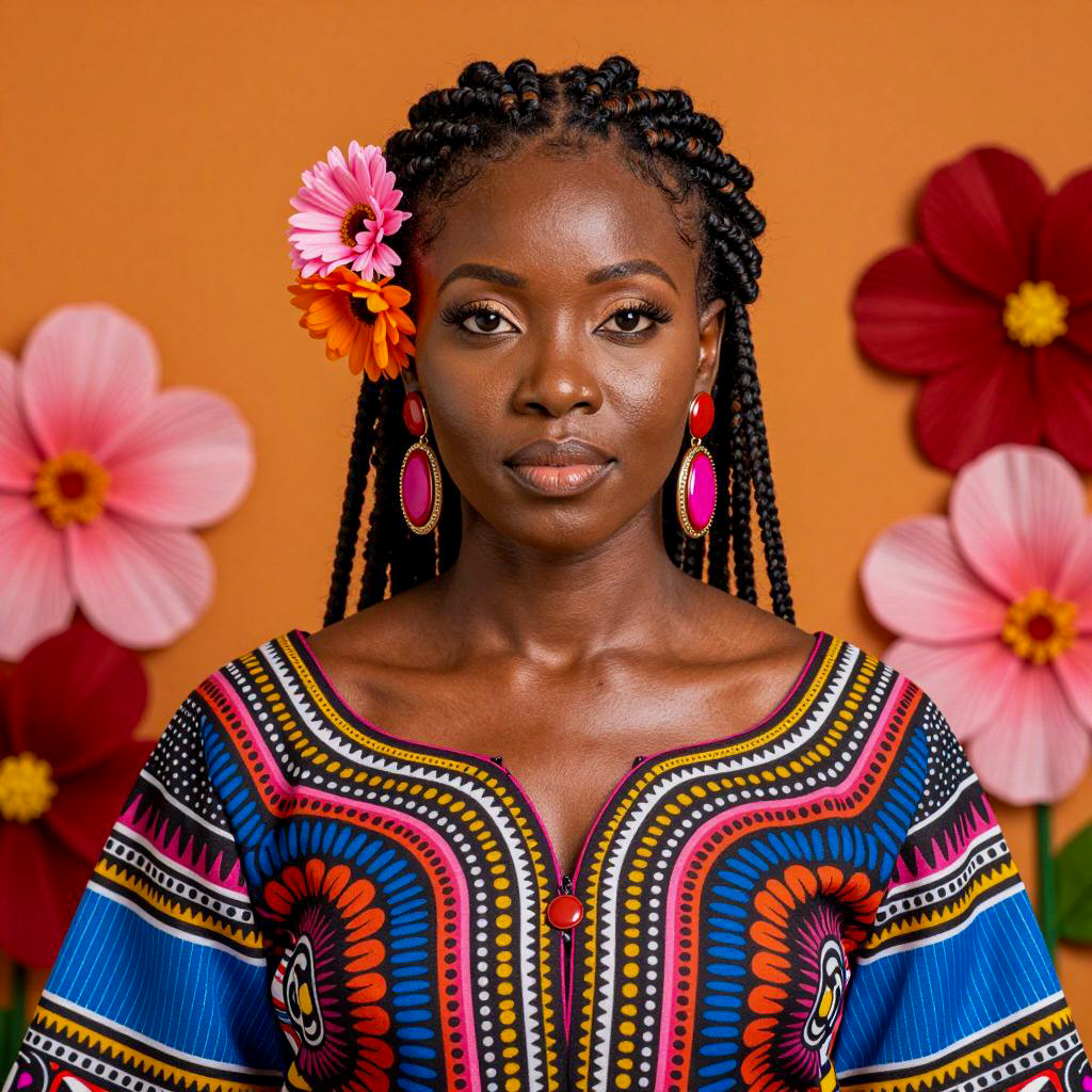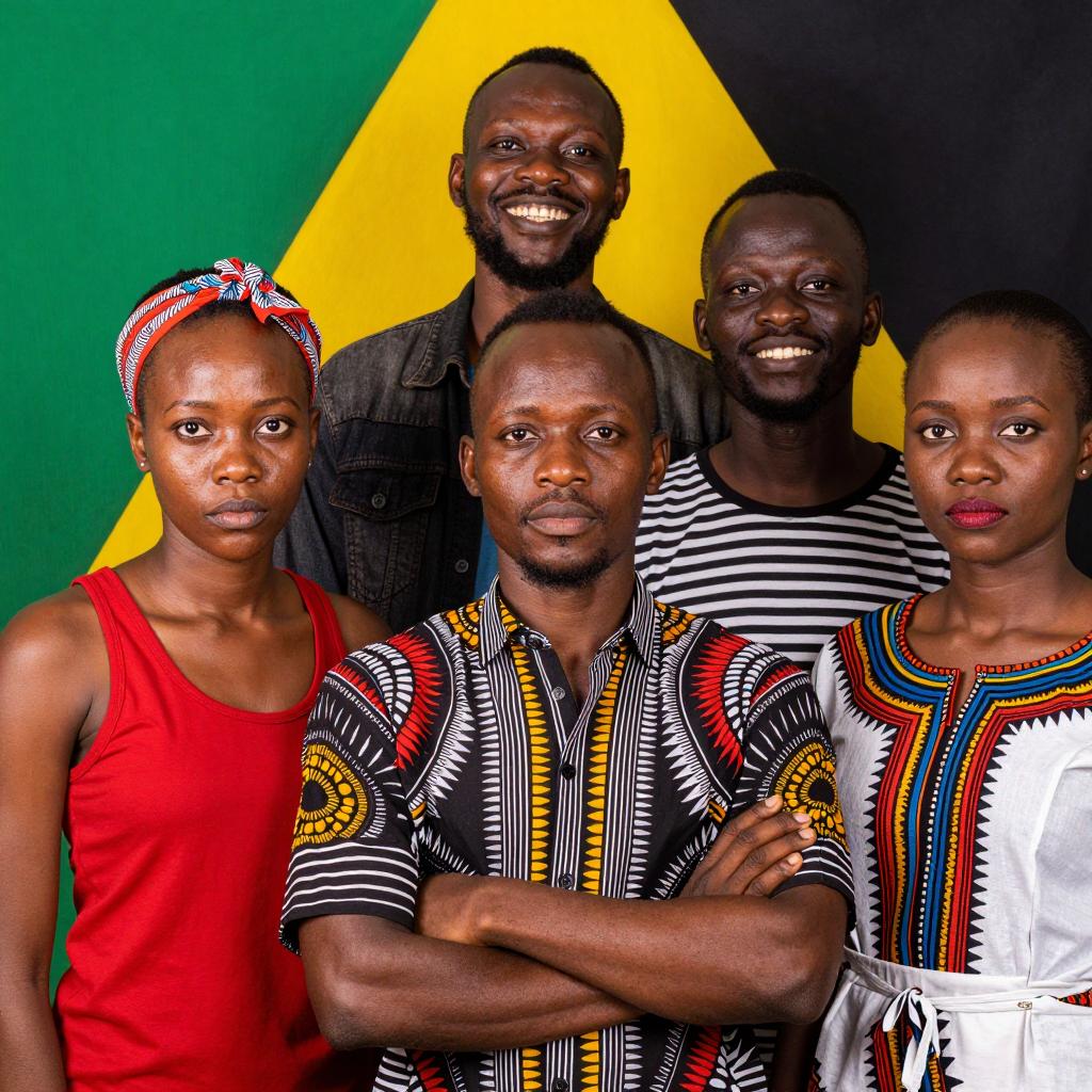 Group of five Black people standing against a green, yellow, and black triangular background. The man in the back smiles widely, wearing a dark jacket. The woman on the left wears a red tank top and headband, looking serious. The man in front, center, crosses his arms, wearing a colorful patterned shirt. The man on the right, wearing a striped shirt, smiles. The woman on the far right wears a white outfit with colorful patterns, looking at the camera. All have dark skin.