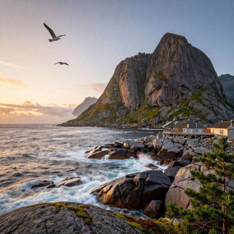 Lofoten rugged coastline with towering granite cliffs, wild crashing waves, seabirds flying low overhead, lush moss and pine trees on rocks, sunset casting warm golden glow over ocean horizon, expansive scenic view, ultra-realistic vibrant nature depiction