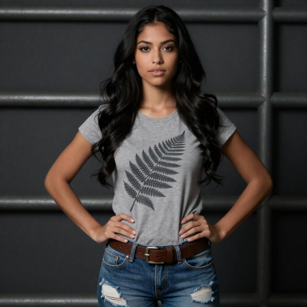 Photograph of a young woman with long, wavy black hair, wearing a gray, fern-patterned t-shirt and distressed blue jeans with a wide brown belt. She stands with hands on hips, against a dark, industrial background with metallic ures. She has a slender build, tan skin, and a confident expression.